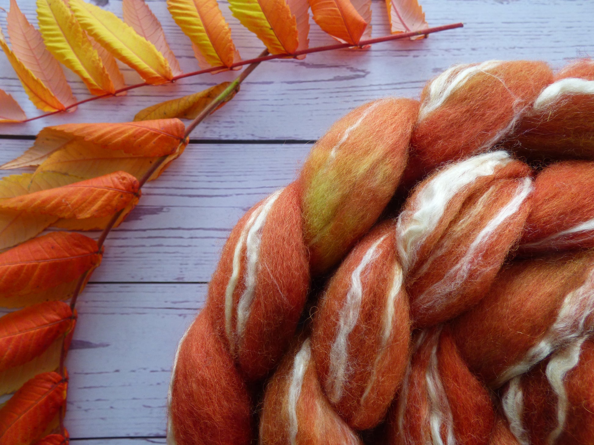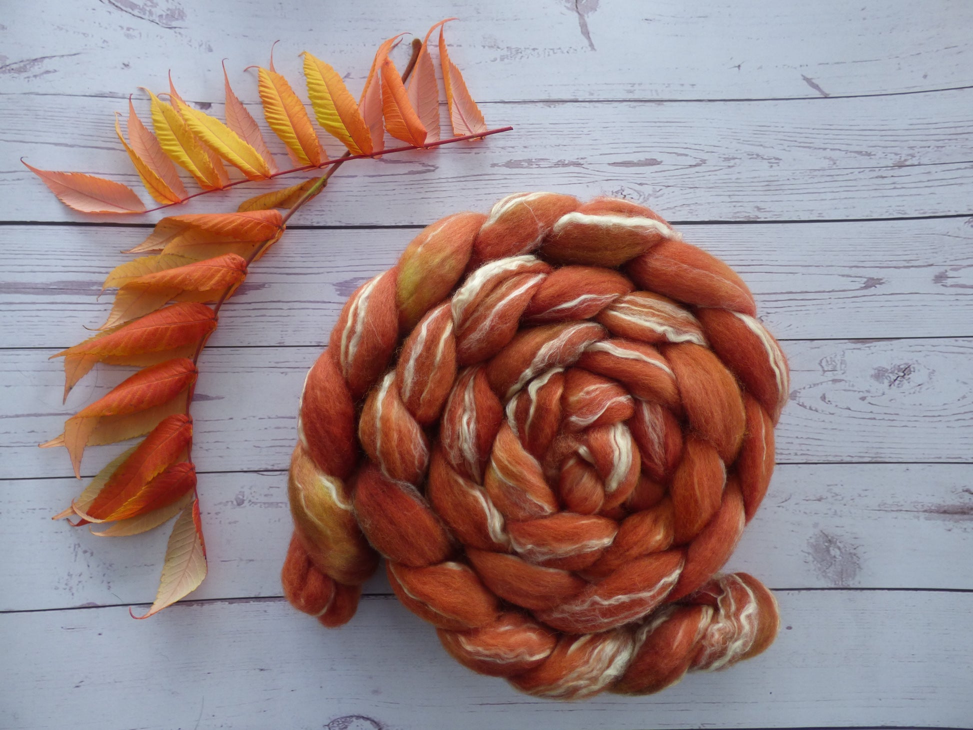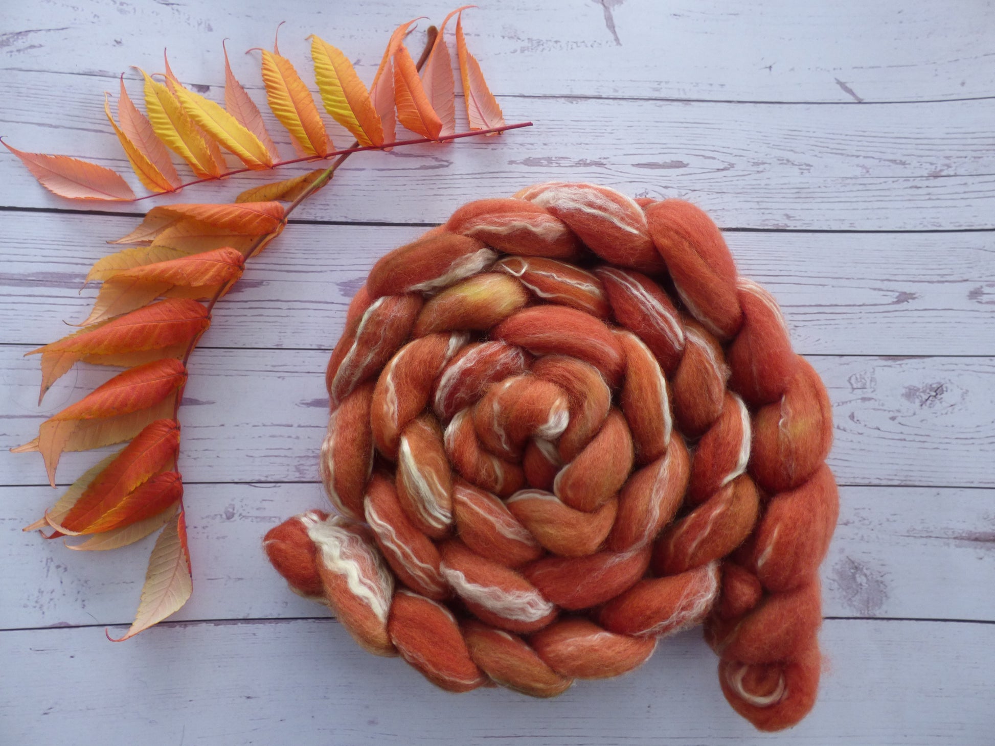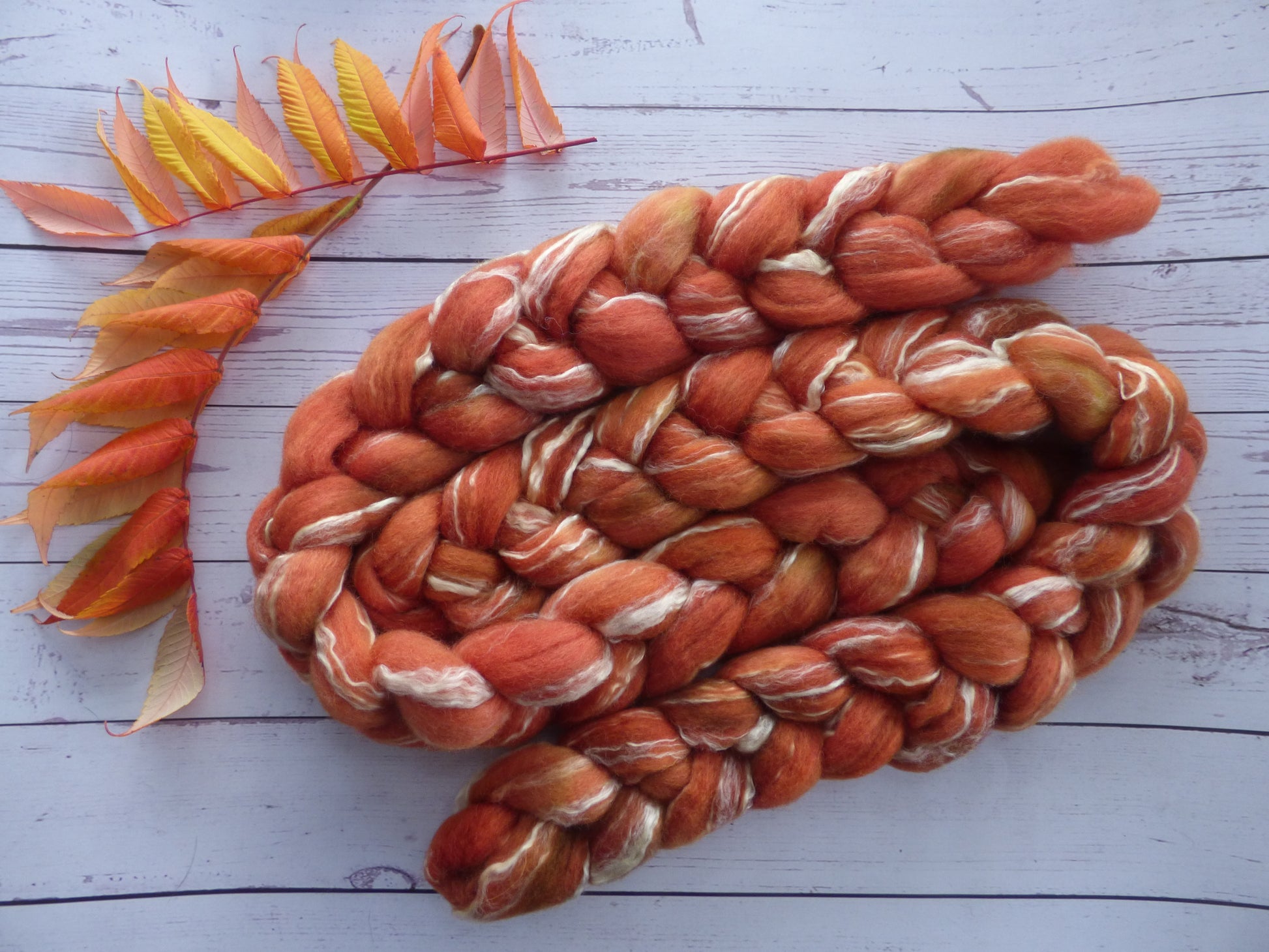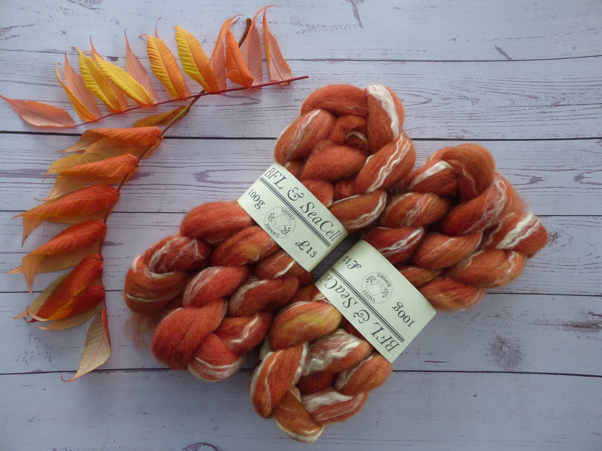 Commercially prepared BFL & SeaCell top, hand dyed by me using high quality acid dyes in a semi-solid orange colourway. Looking for an alternative to nylon for strengthening your handspun BFL sock yarns? Look no further... It's strong, it's shiny, it's not made of plastic. SeaCell is a sustainable fibre made from seaweed and wood pulp with complementary breathable qualities to wool.