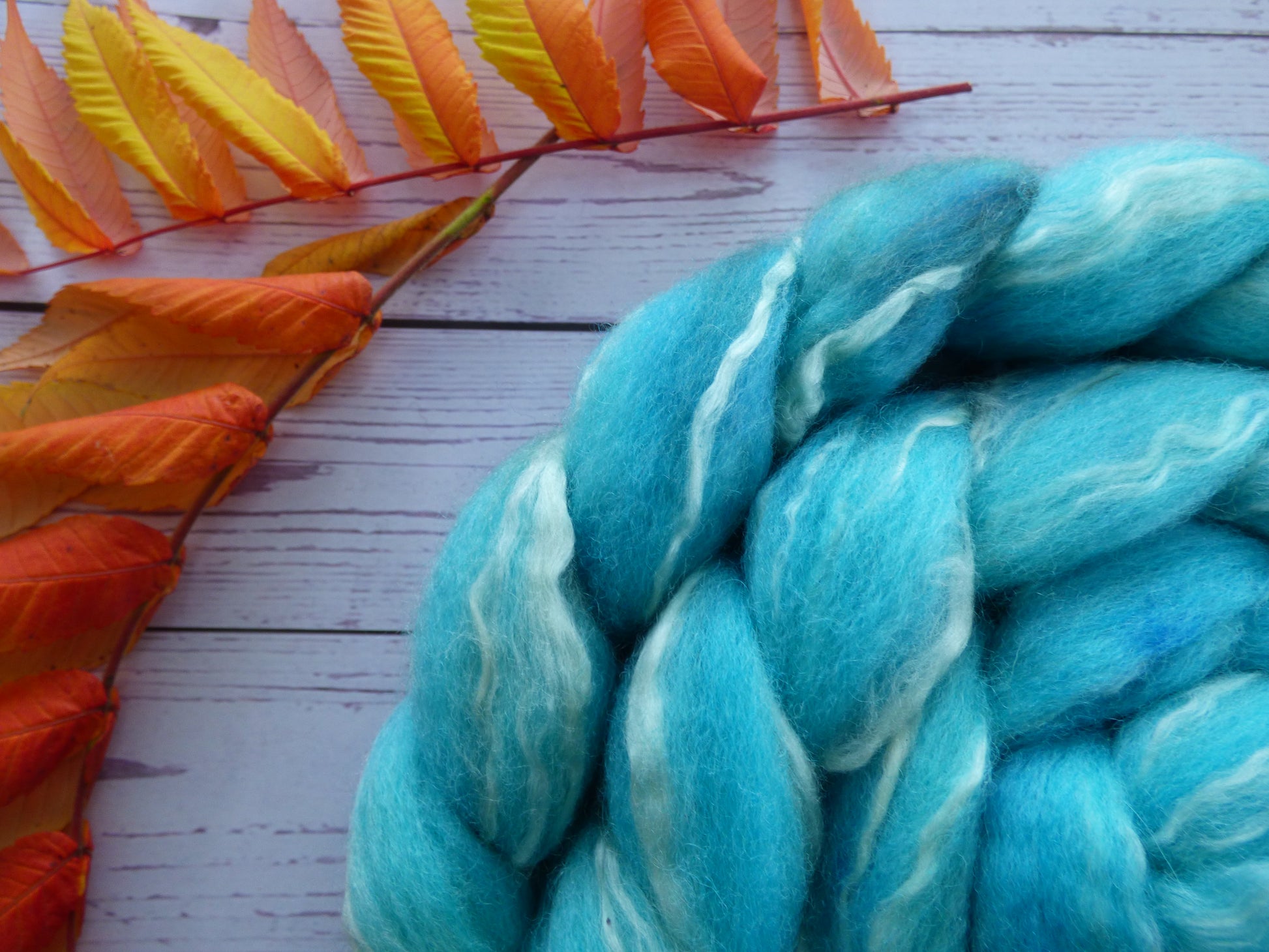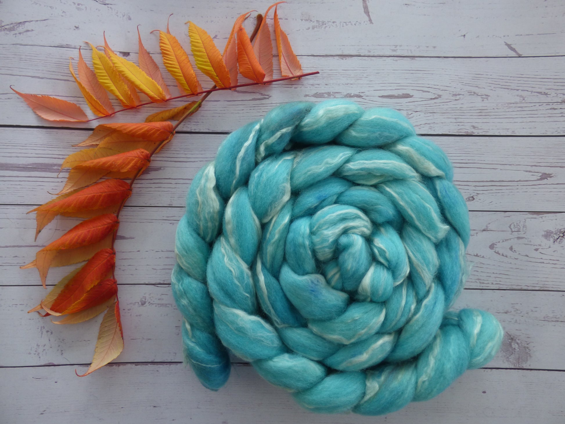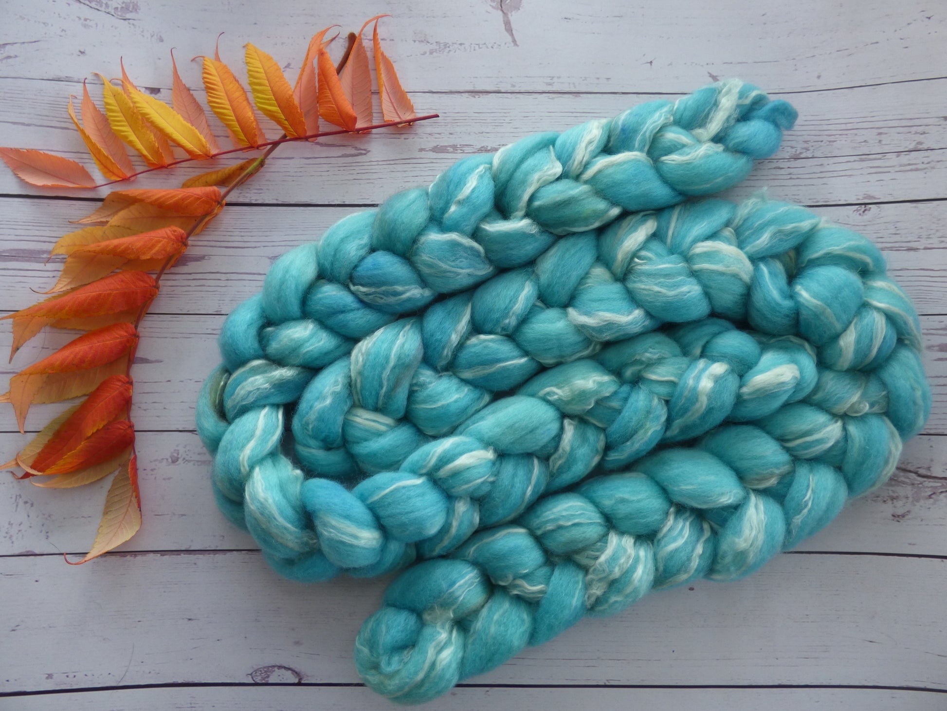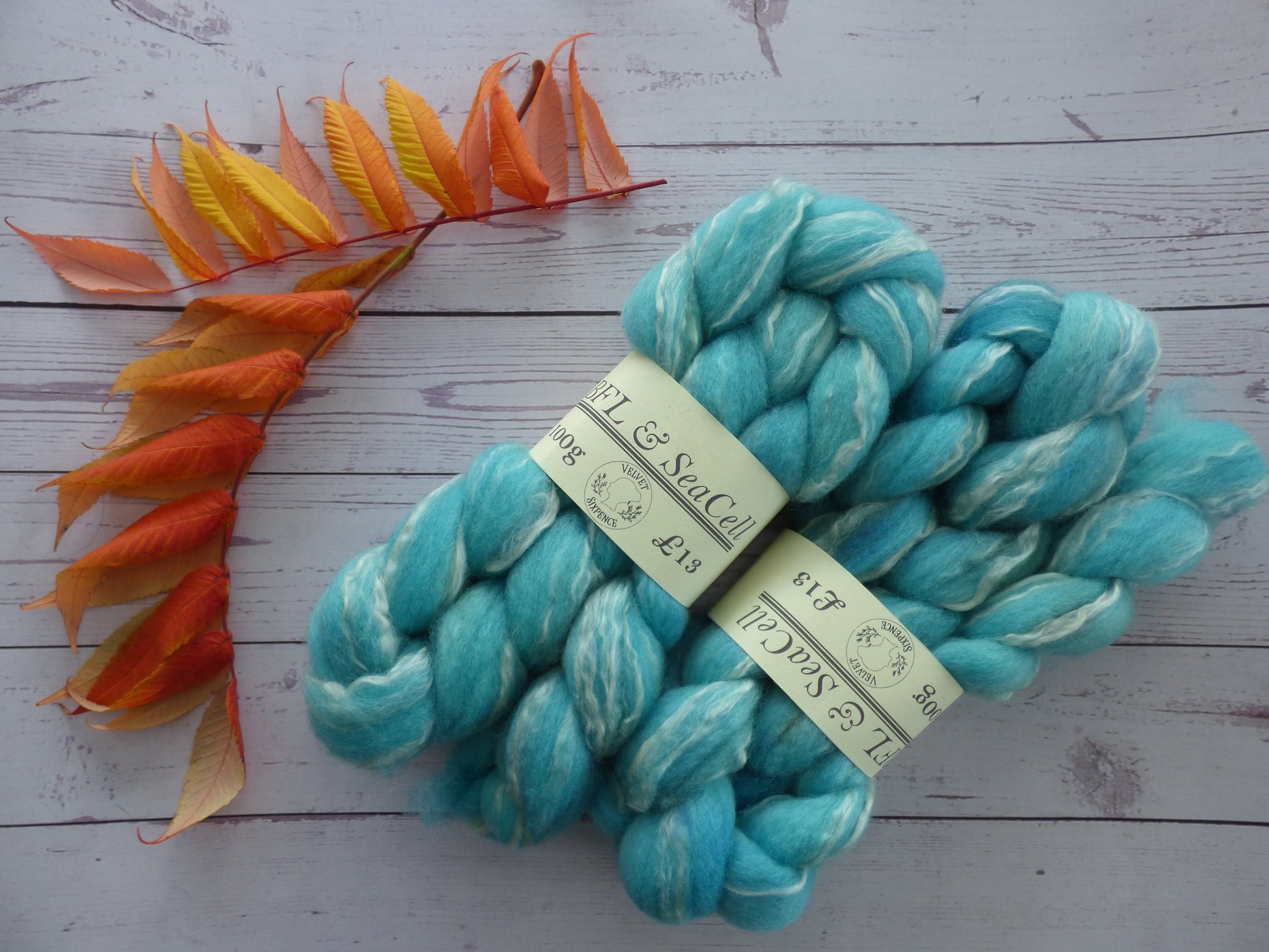 Commercially prepared BFL & SeaCell top, hand dyed by me using high quality acid dyes in a semi-solid turquoise colourway. Looking for an alternative to nylon for strengthening your handspun BFL sock yarns? Look no further... It's strong, it's shiny, it's not made of plastic. SeaCell is a sustainable fibre made from seaweed and wood pulp with complementary breathable qualities to wool.