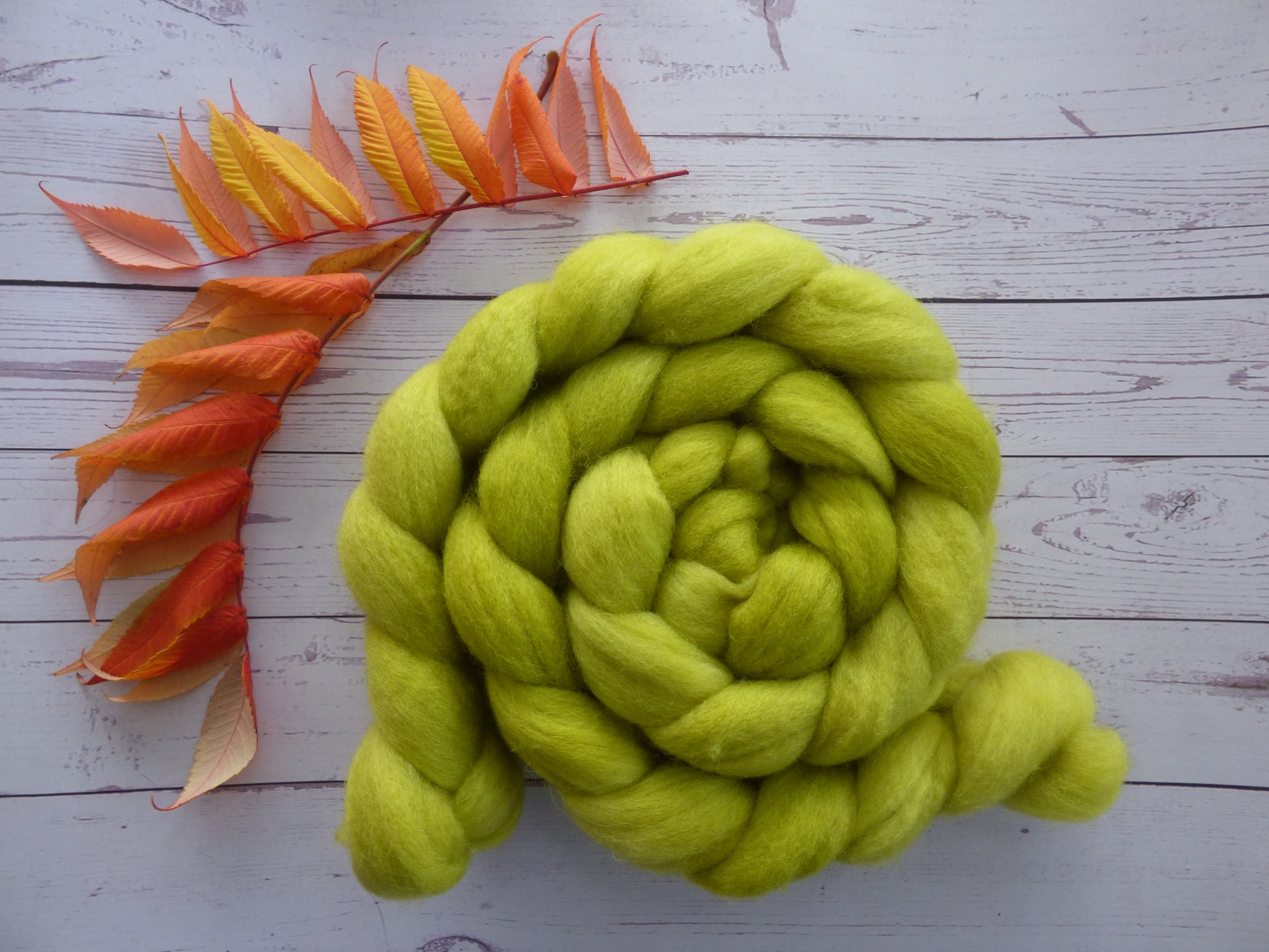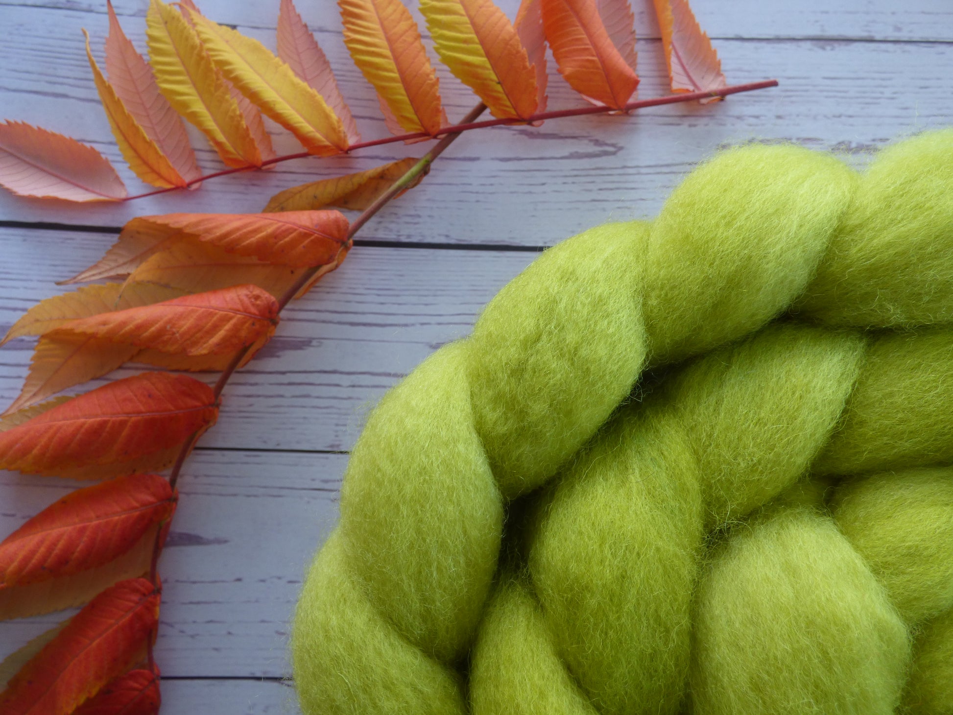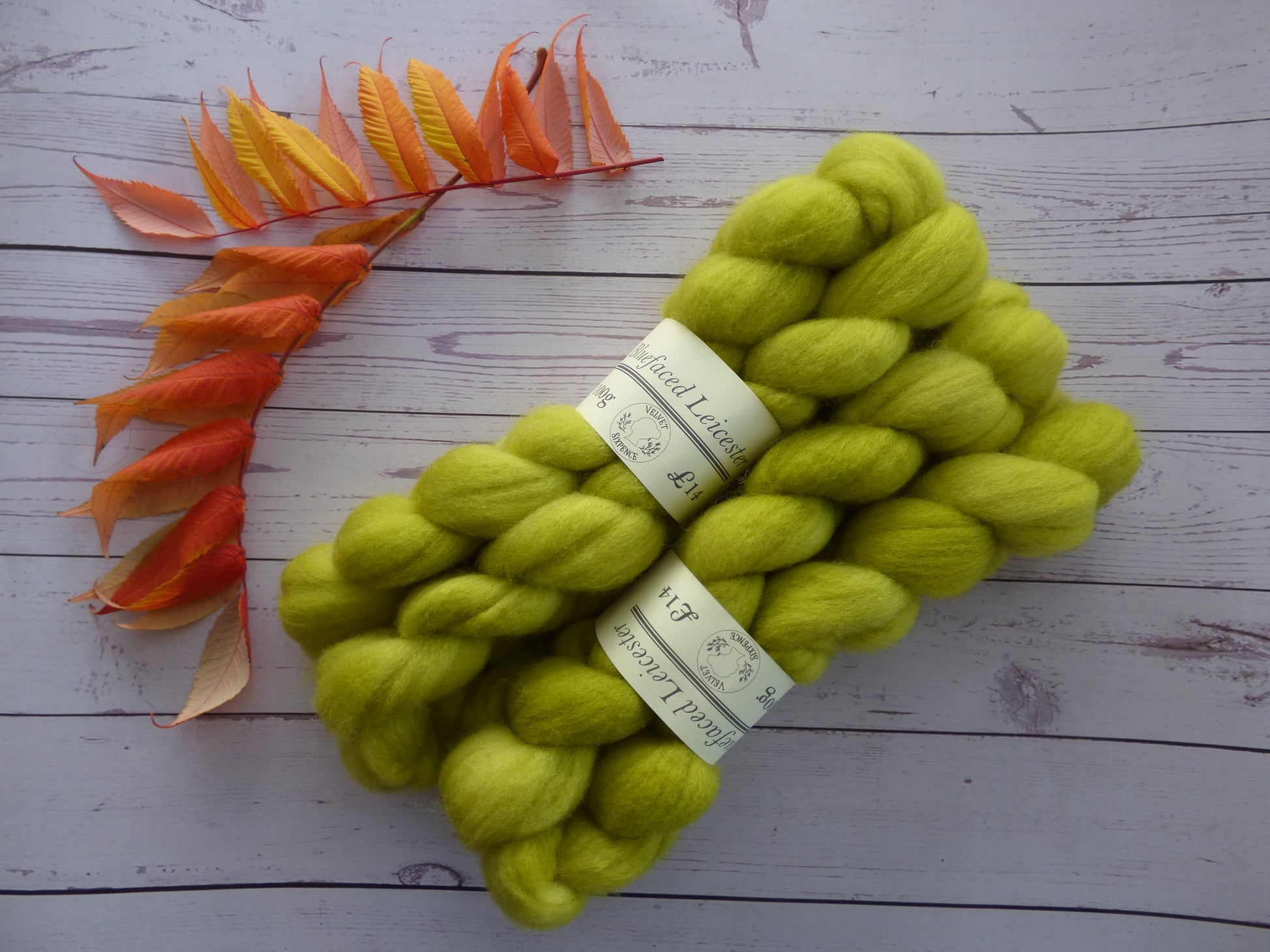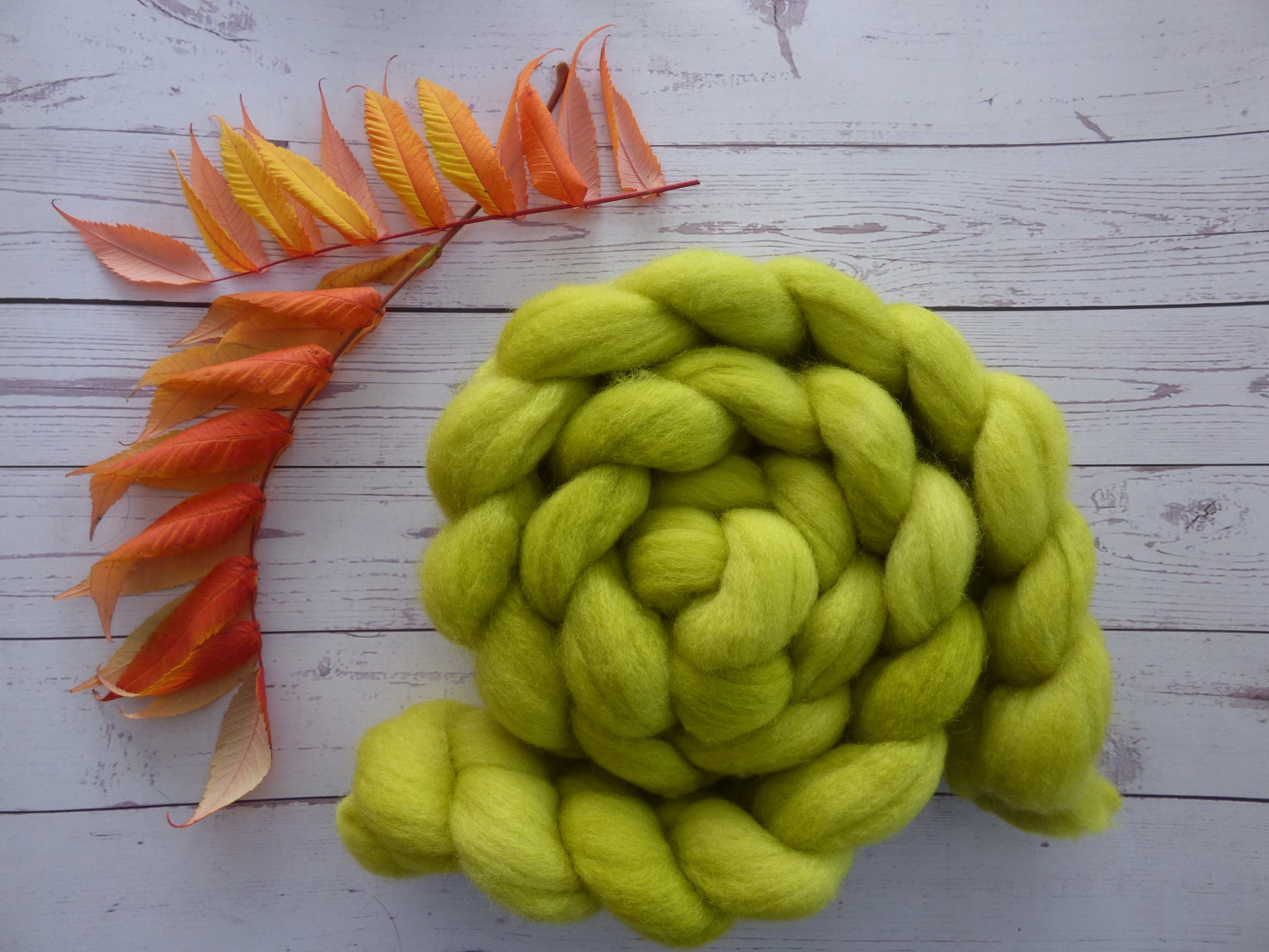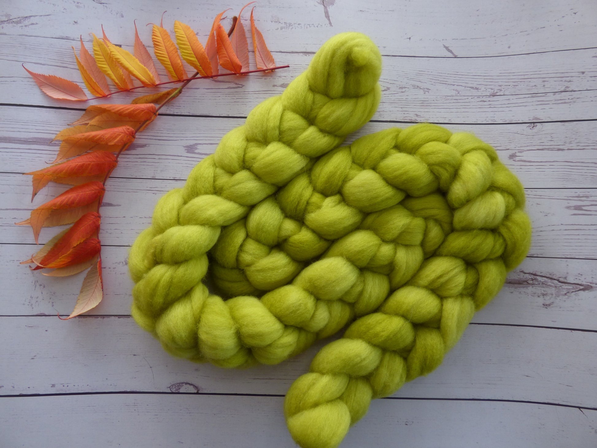 Commercially prepared Bluefaced Leicester top, hand dyed by me using high quality acid dyes in a light green colourway. Bluefaced leicester is soft, it's British, and it's also got a slightly longer staple that makes it suitable for beginners as well as more experienced spinners.