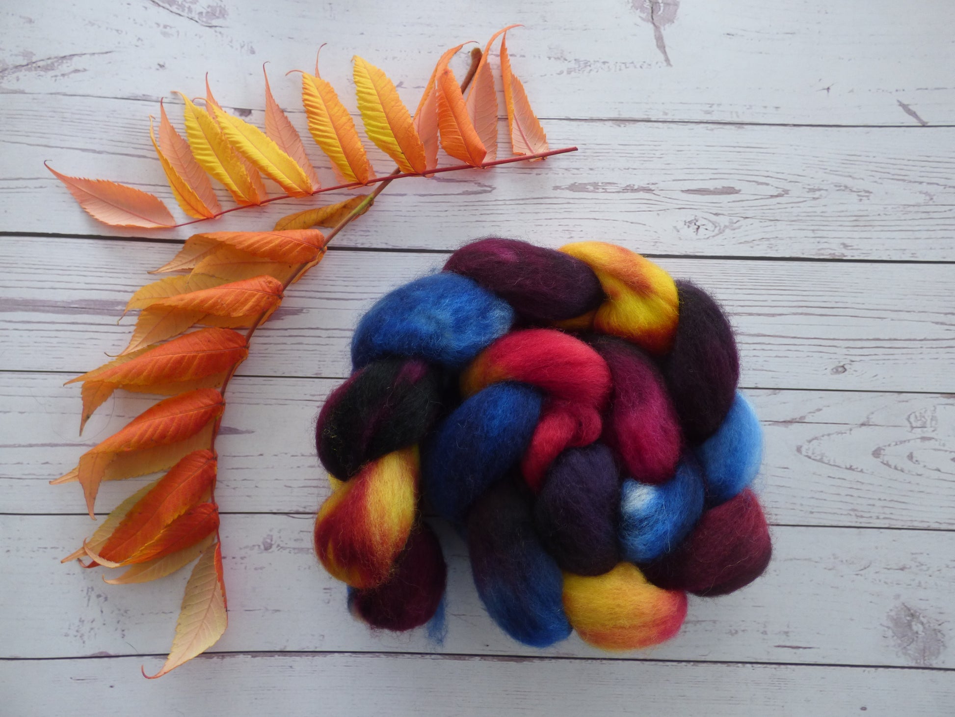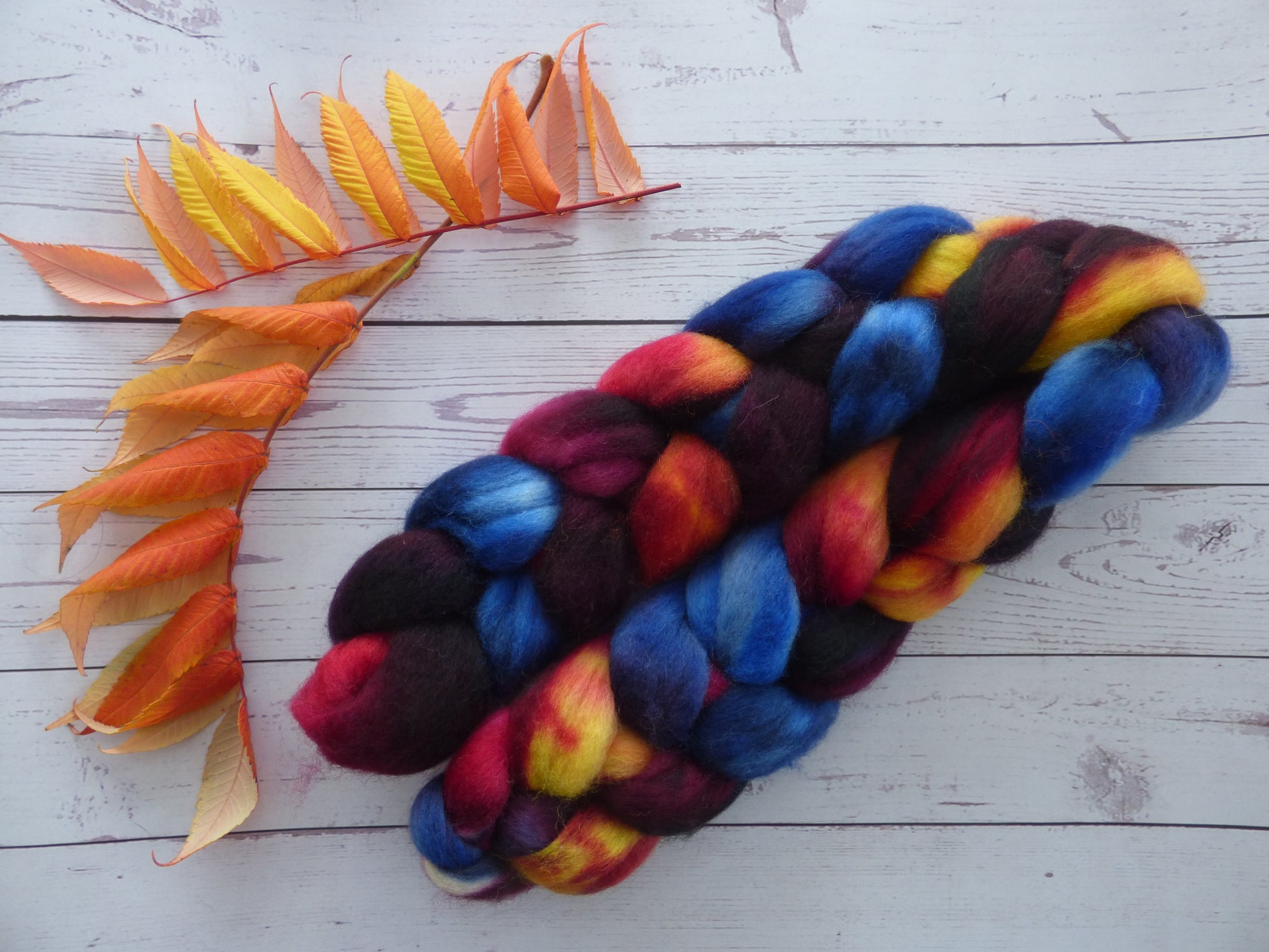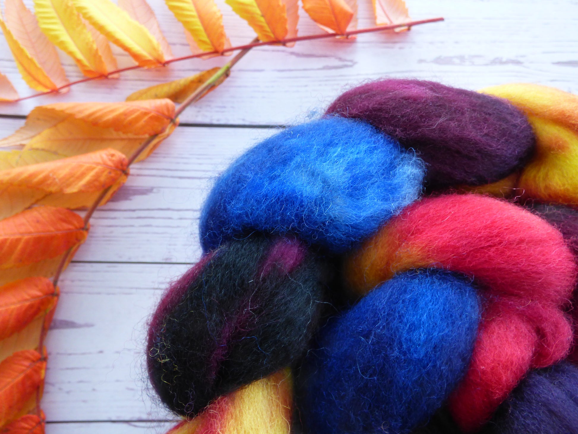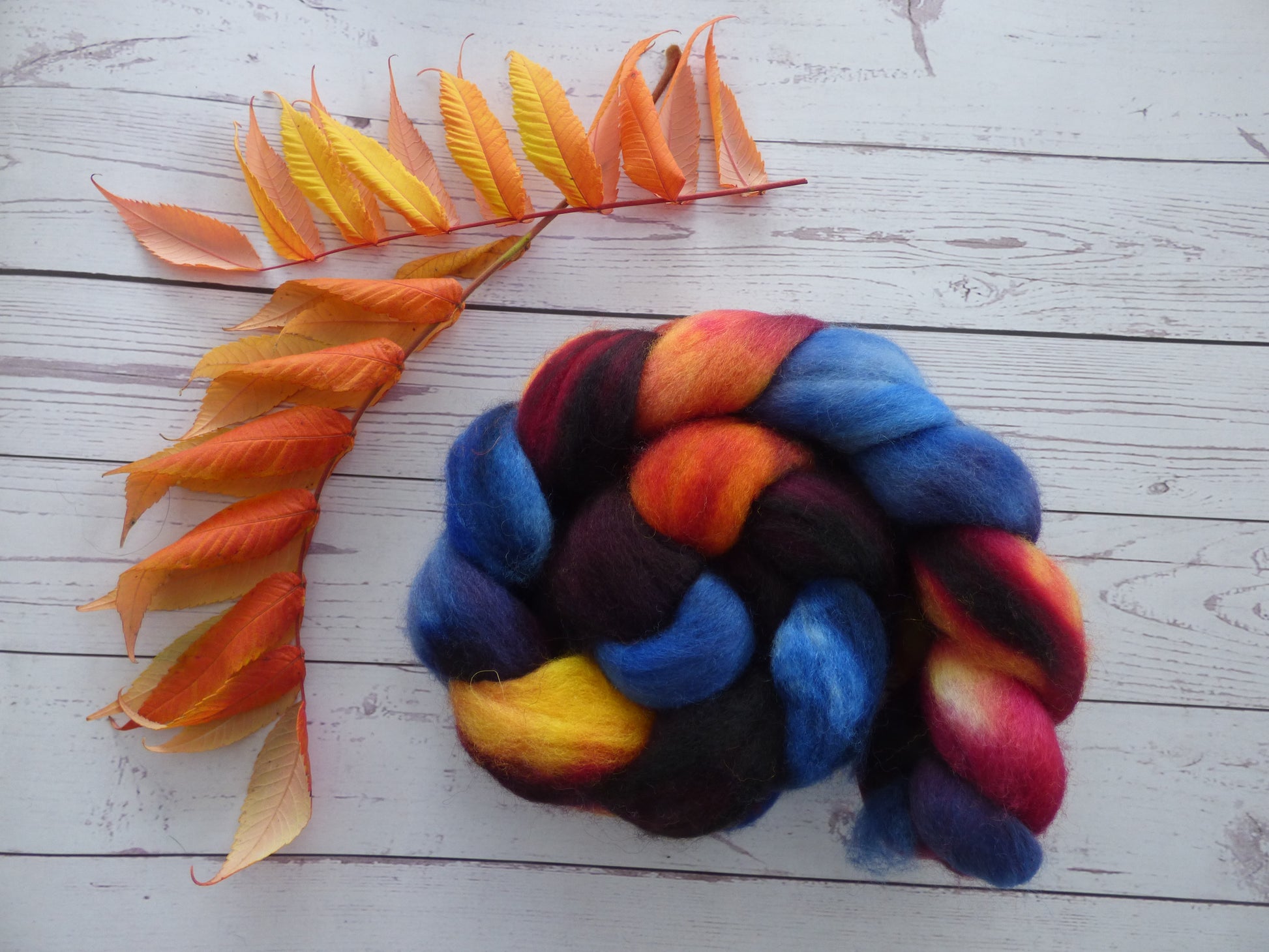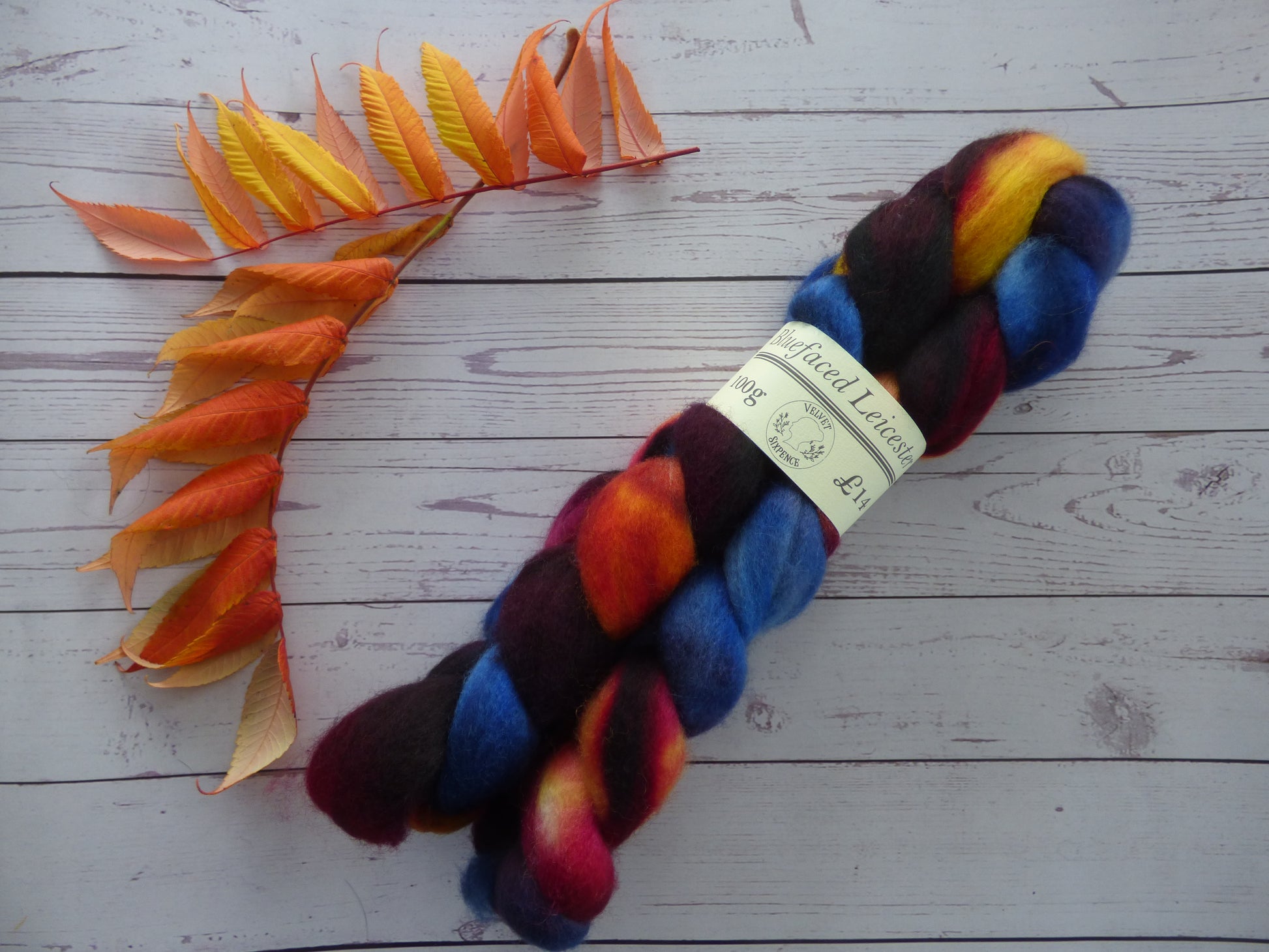 Commercially prepared Bluefaced Leicester top, hand dyed by me using high quality acid dyes in a variegated colourway. Bluefaced leicester is soft, it's British, and it's also got a slightly longer staple that makes it suitable for beginners as well as more experienced spinners.