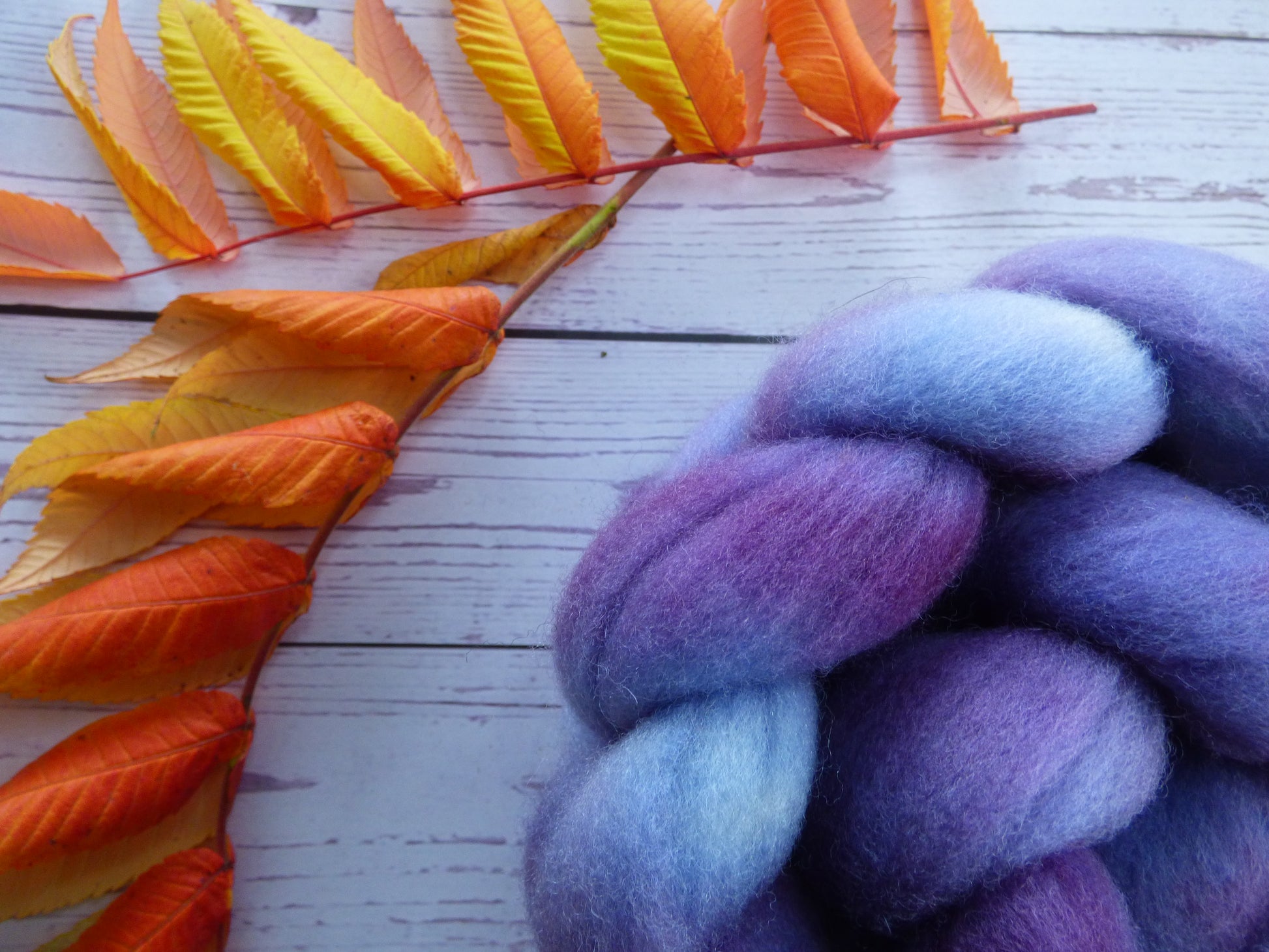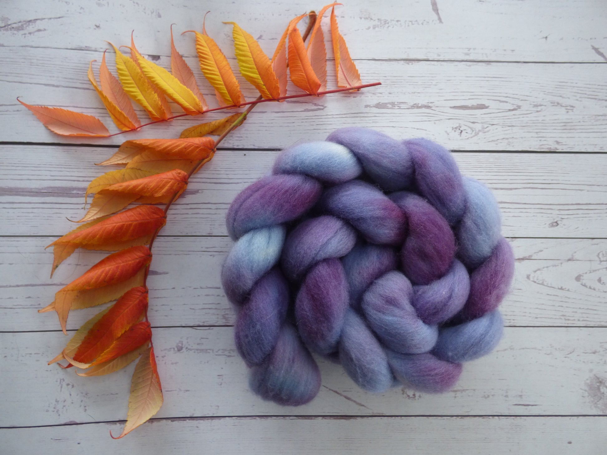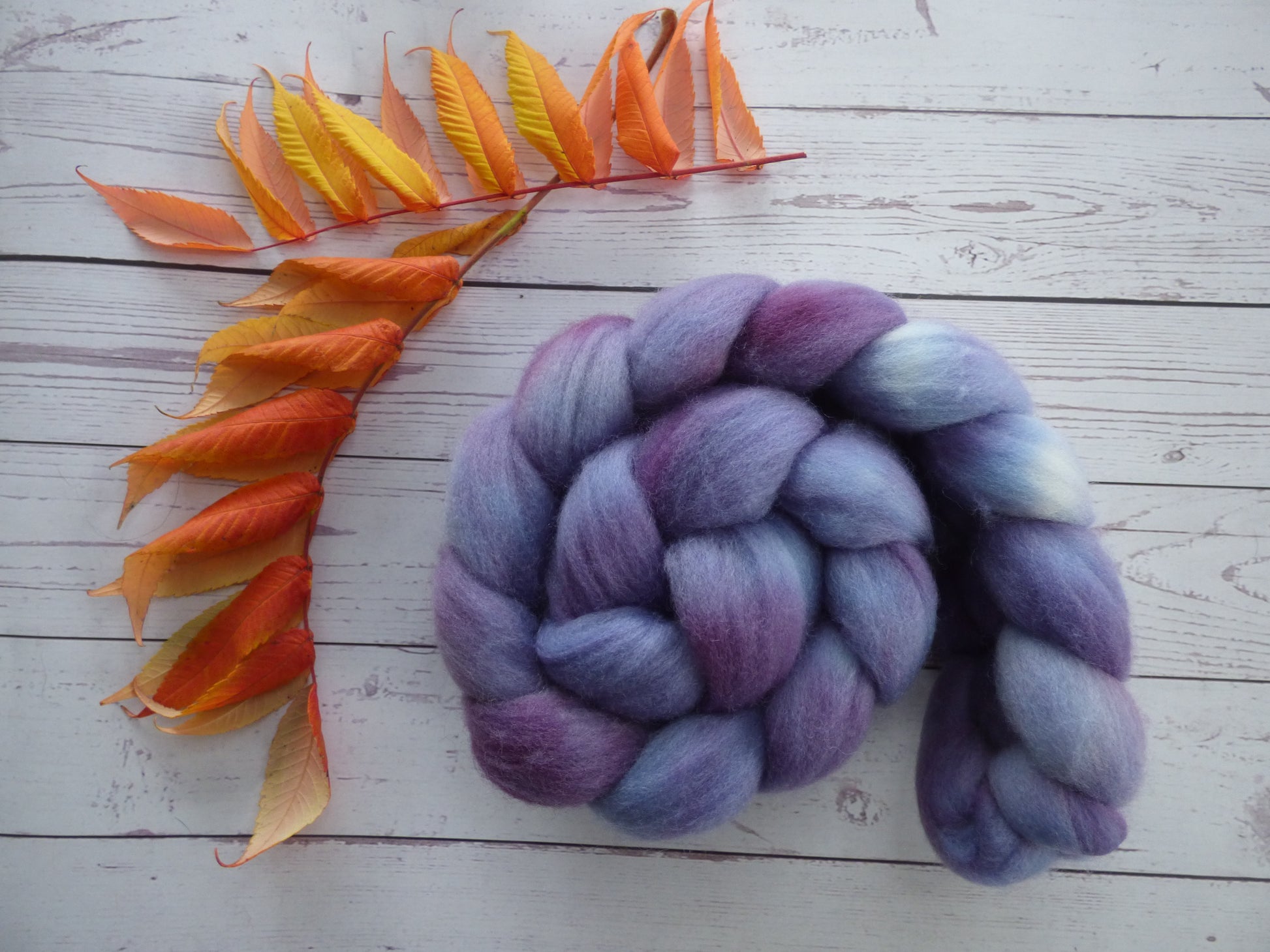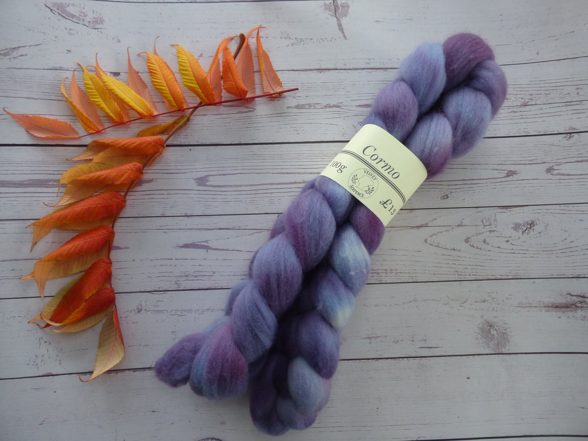 Commercially prepared Cormo top, hand dyed by me using high quality acid dyes in a semi-solid lilac colourway. Cormo sits neatly between Polwarth and Rambouillet in terms of softness and spring.