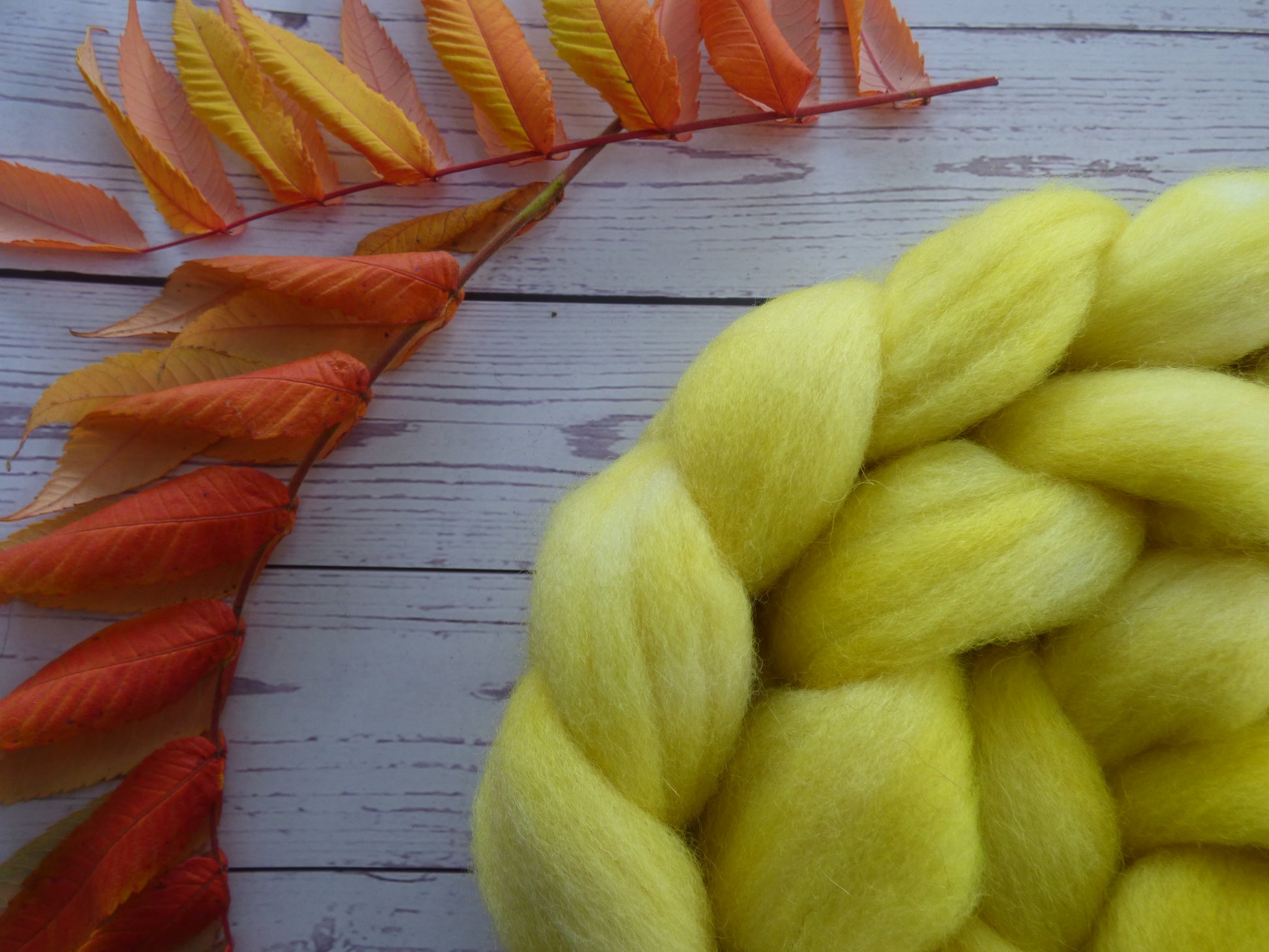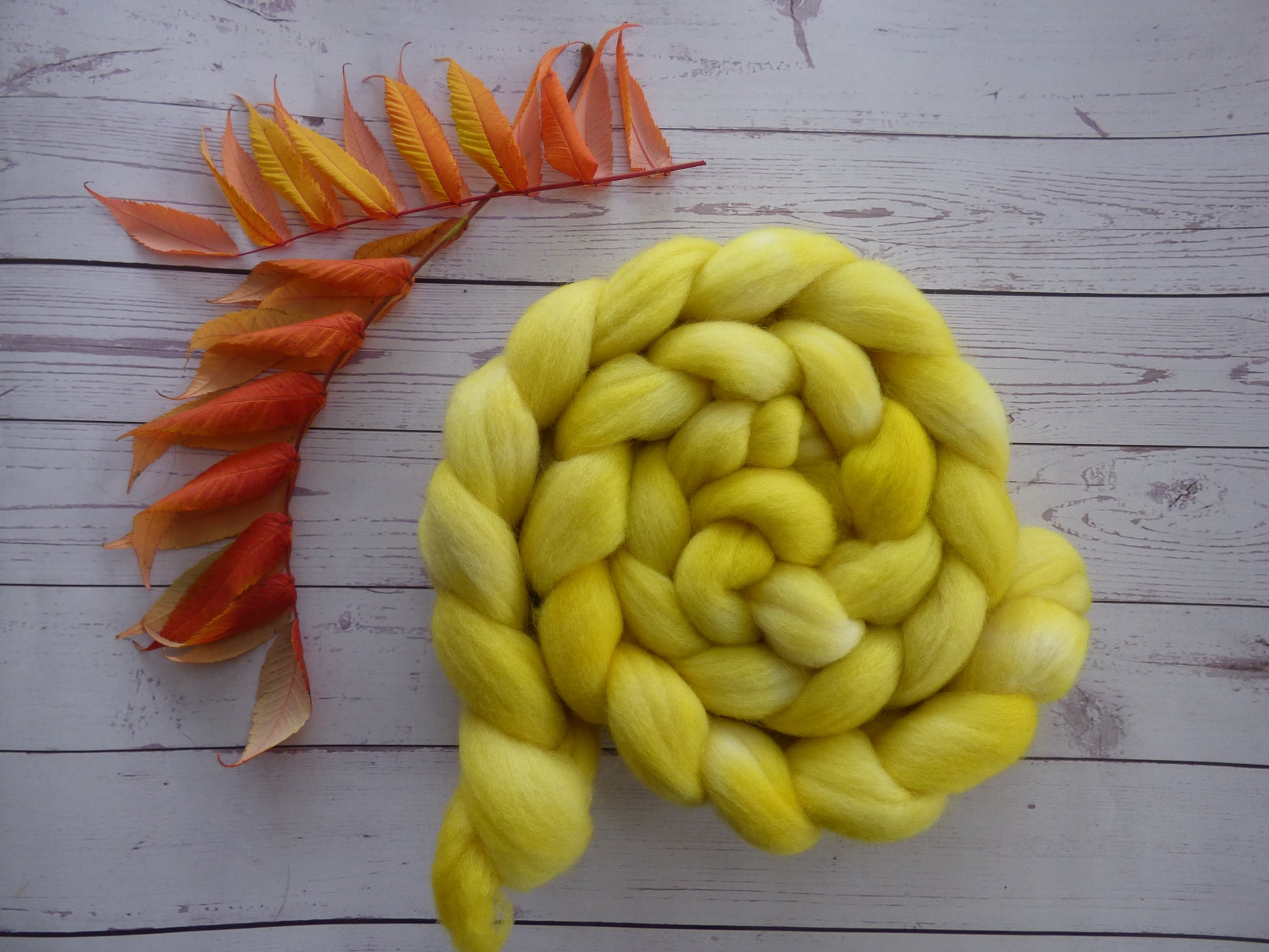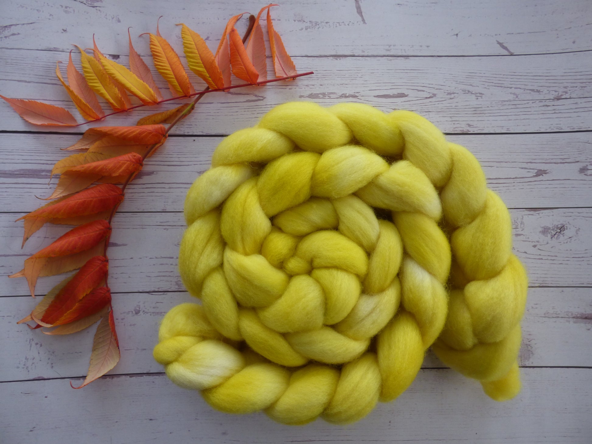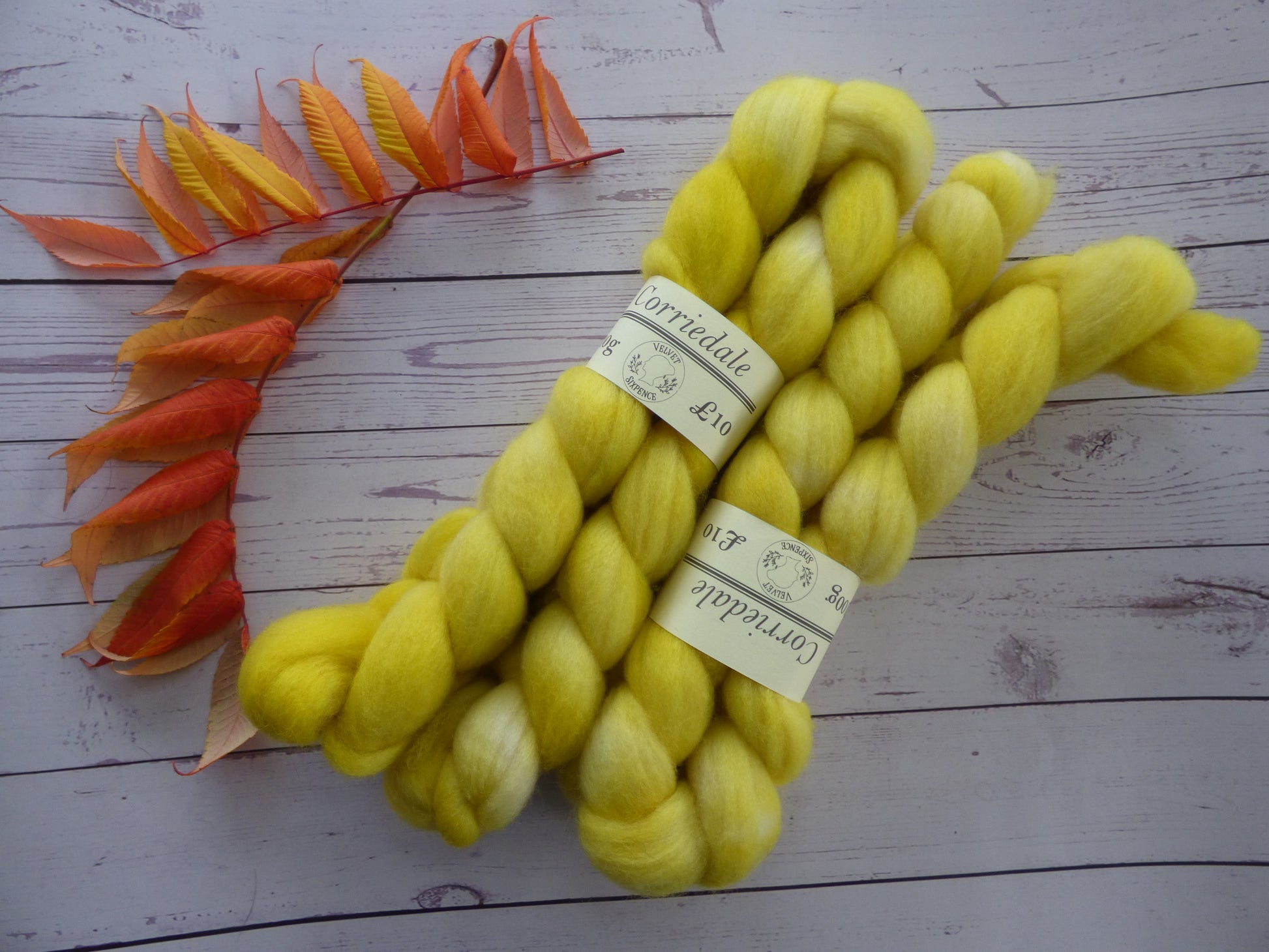 Commercially prepared Corriedale tops, hand dyed by me using high quality acid dyes in a semi-solid yellow colourway.