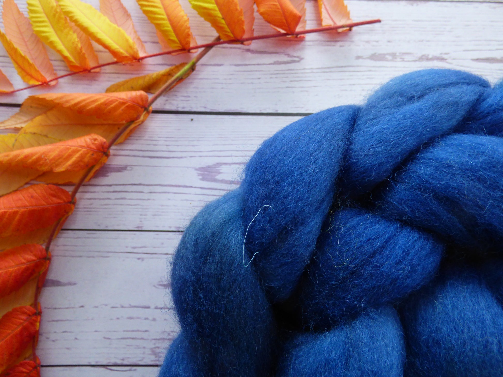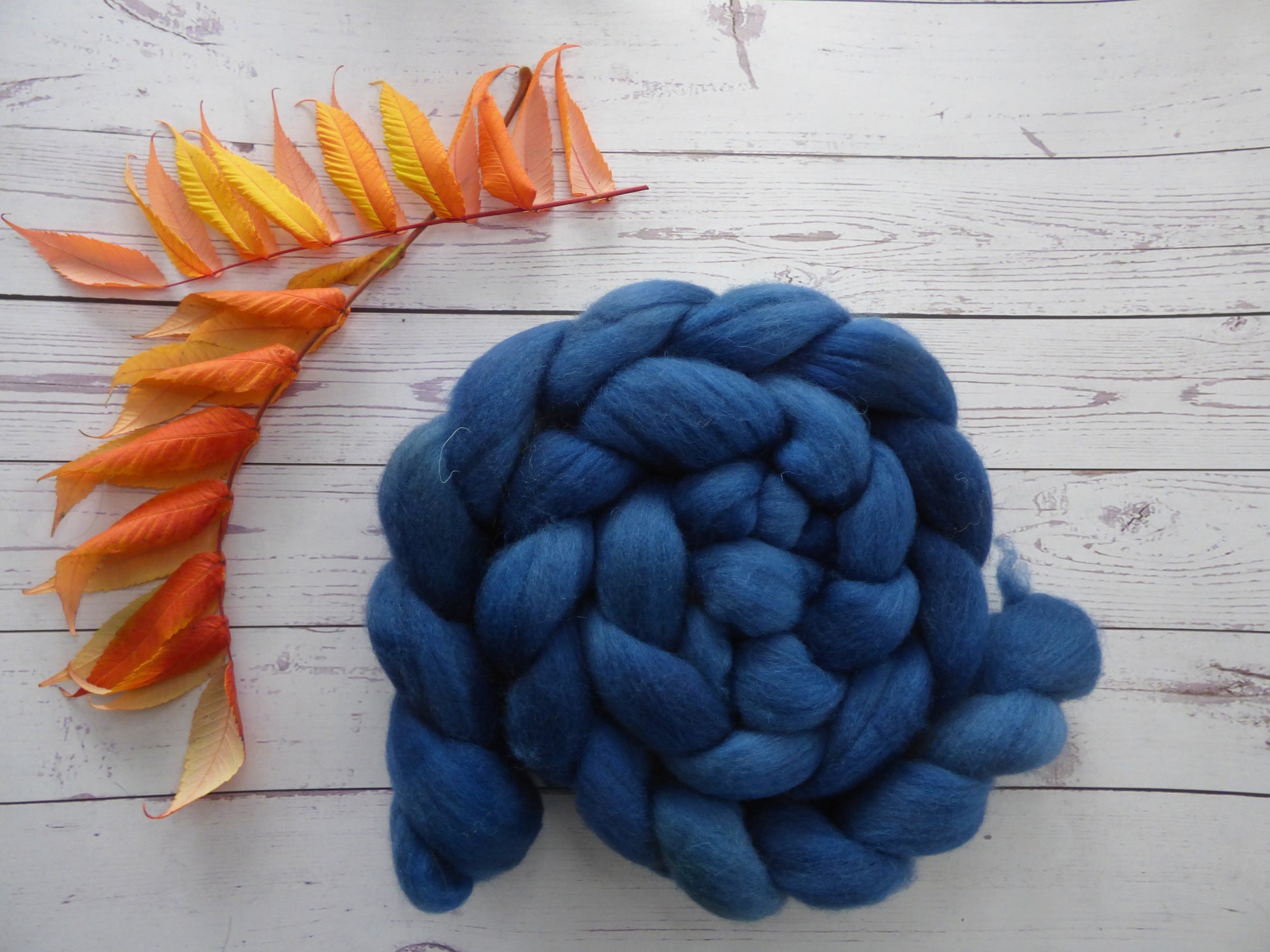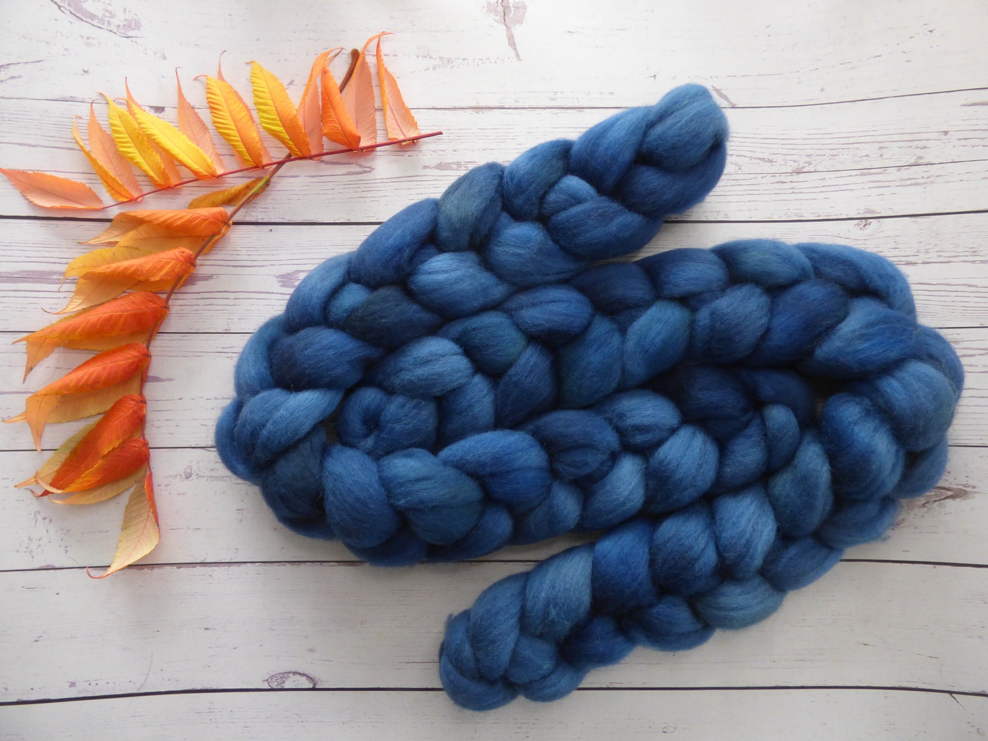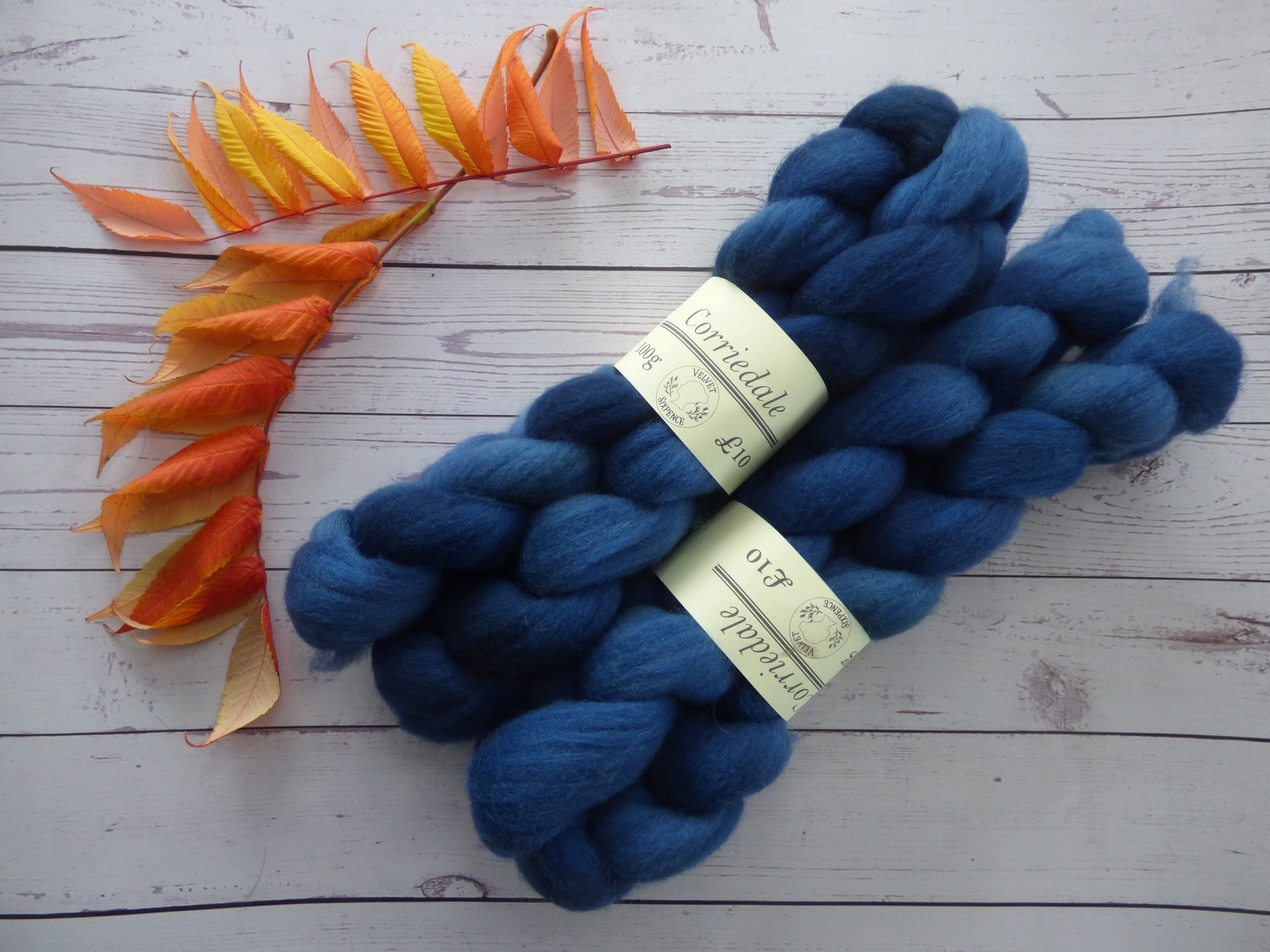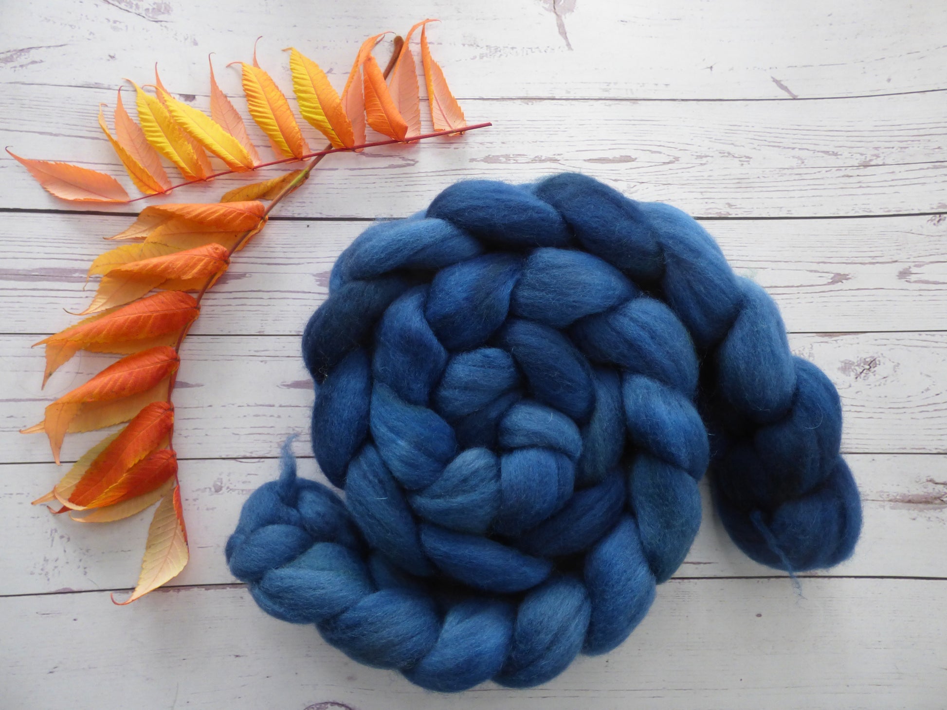 Commercially prepared Corriedale tops, hand dyed by me using high quality acid dyes in a semi-solid dark blue colourway.