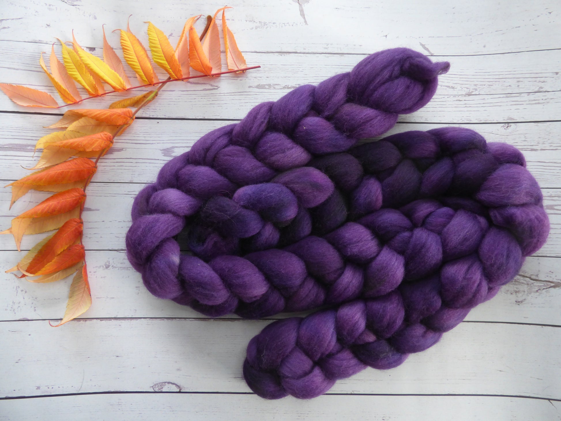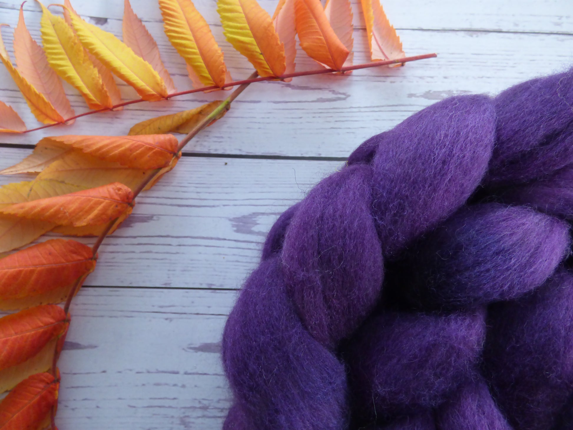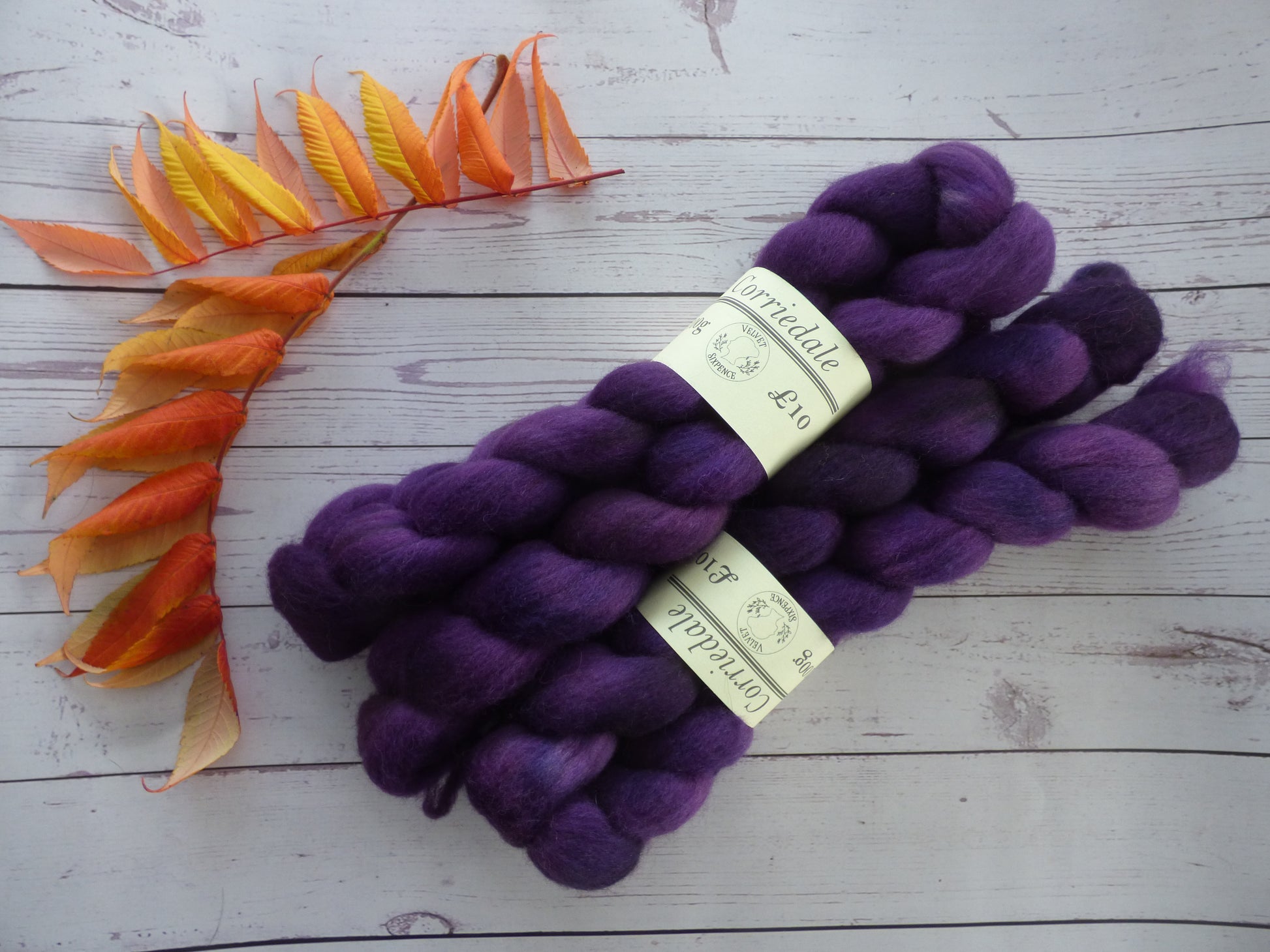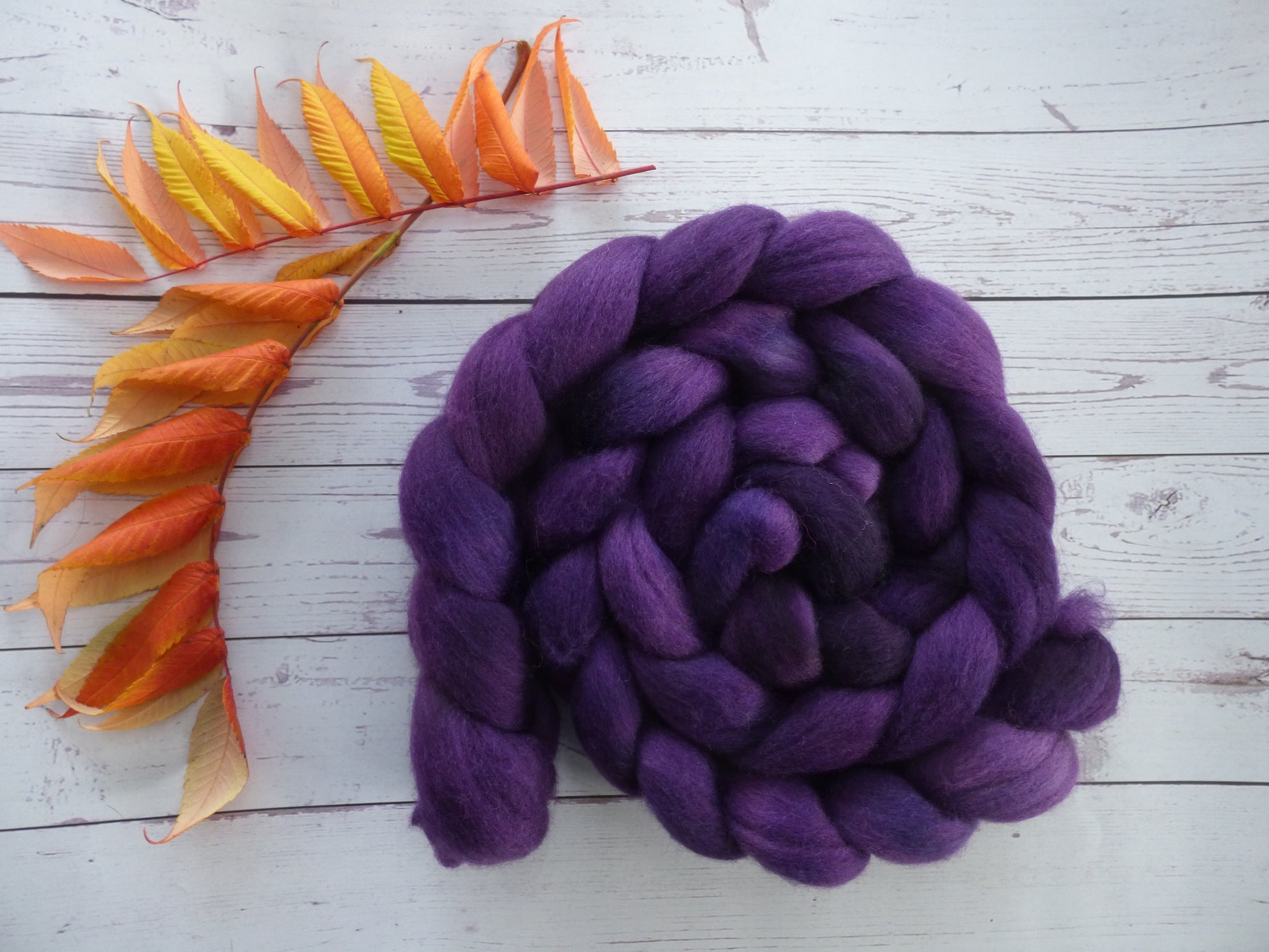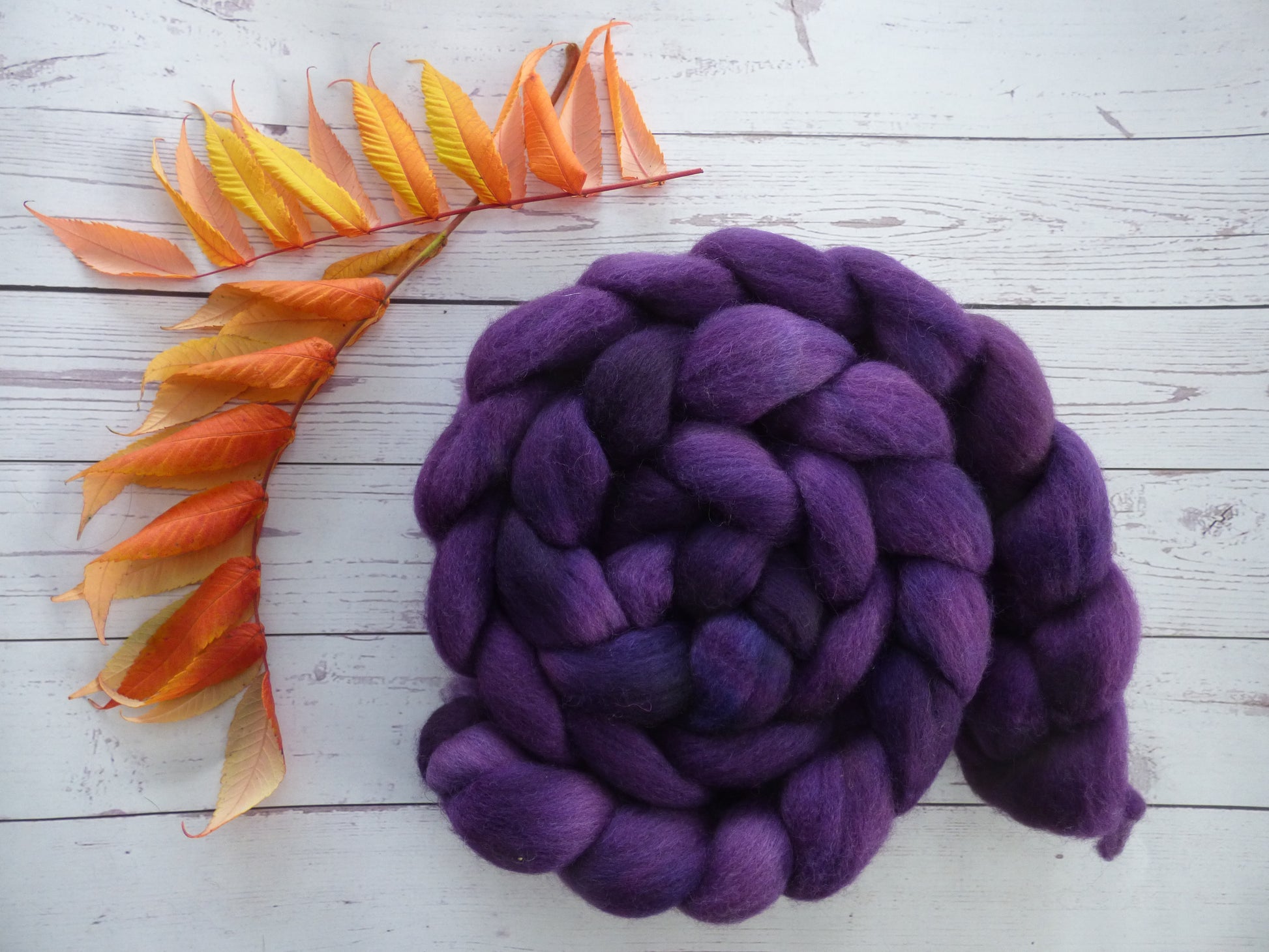 Commercially prepared Corriedale tops, hand dyed by me using high quality acid dyes in a semi-solid purple colourway.