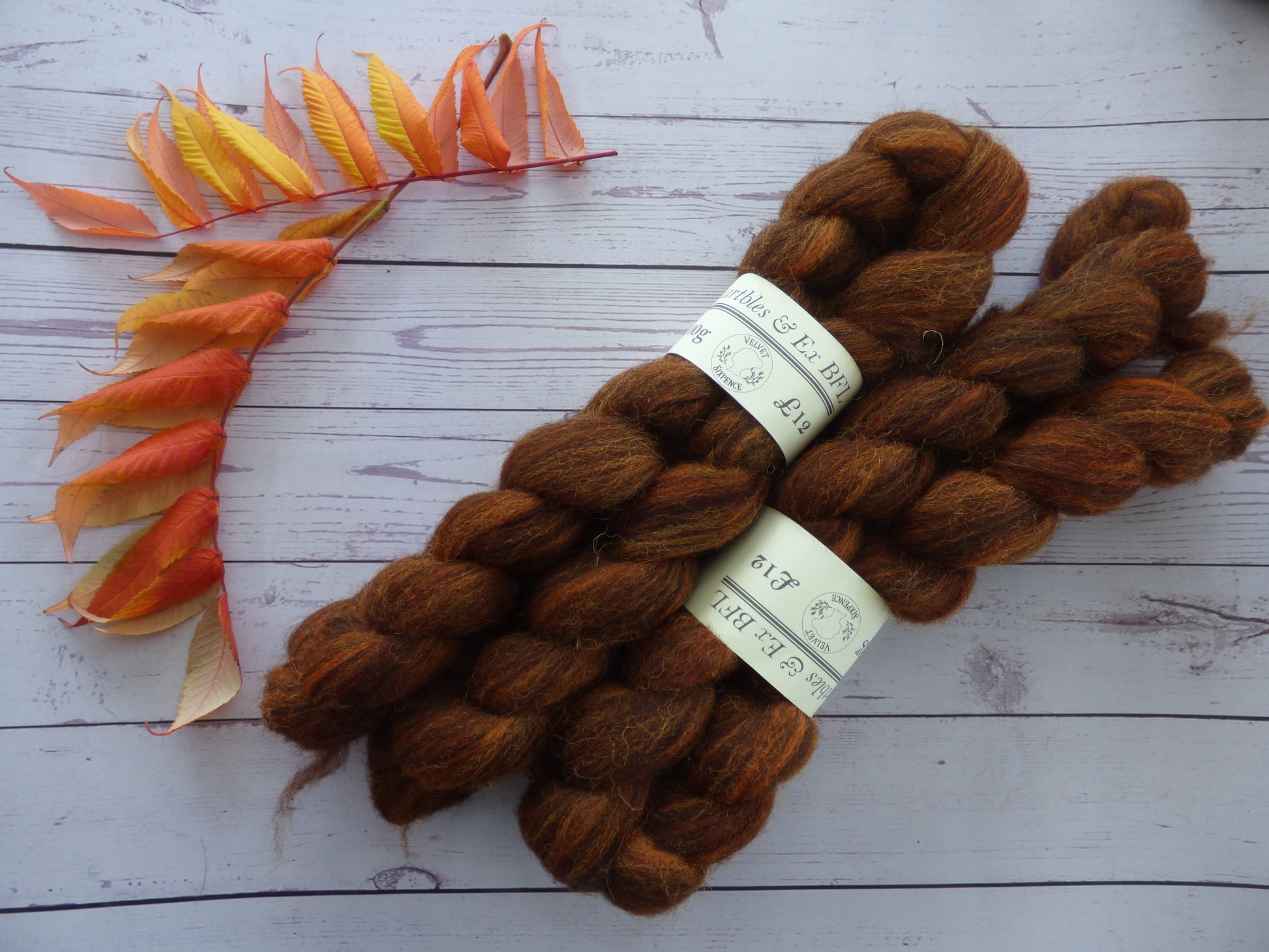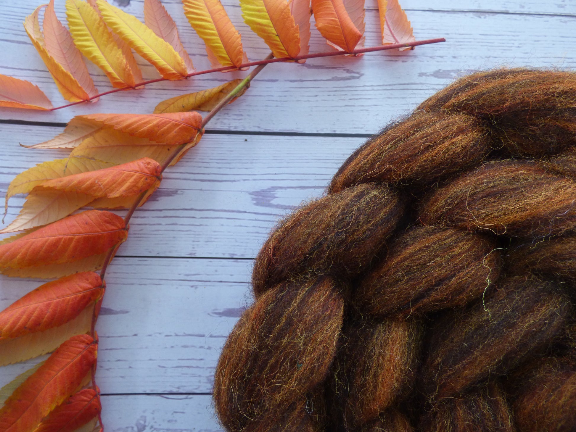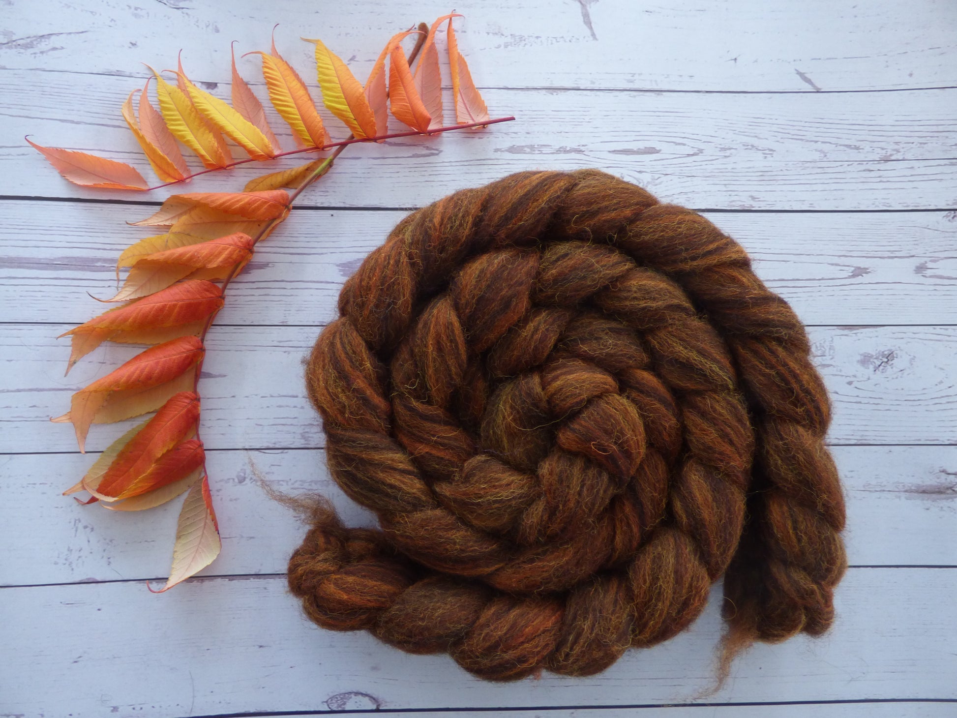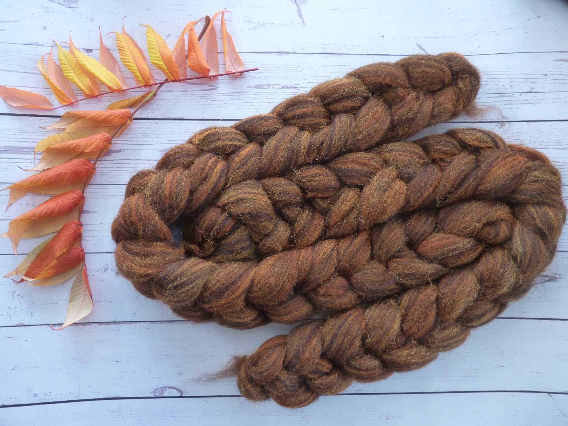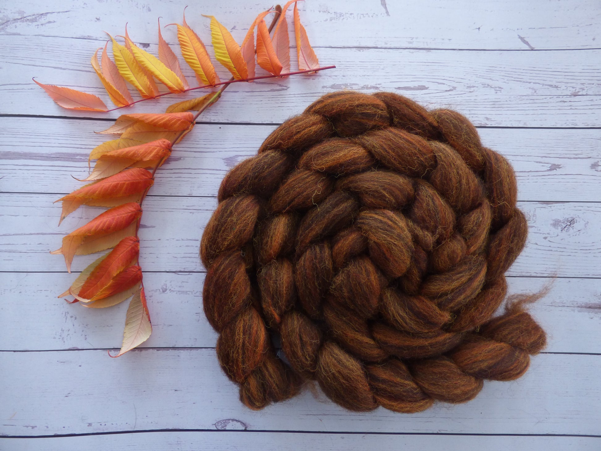 Commercially prepared Zwartbles and Exmoor Blueface top, hand dyed by me using high quality acid dyes in a semi-solid orange colourway.
