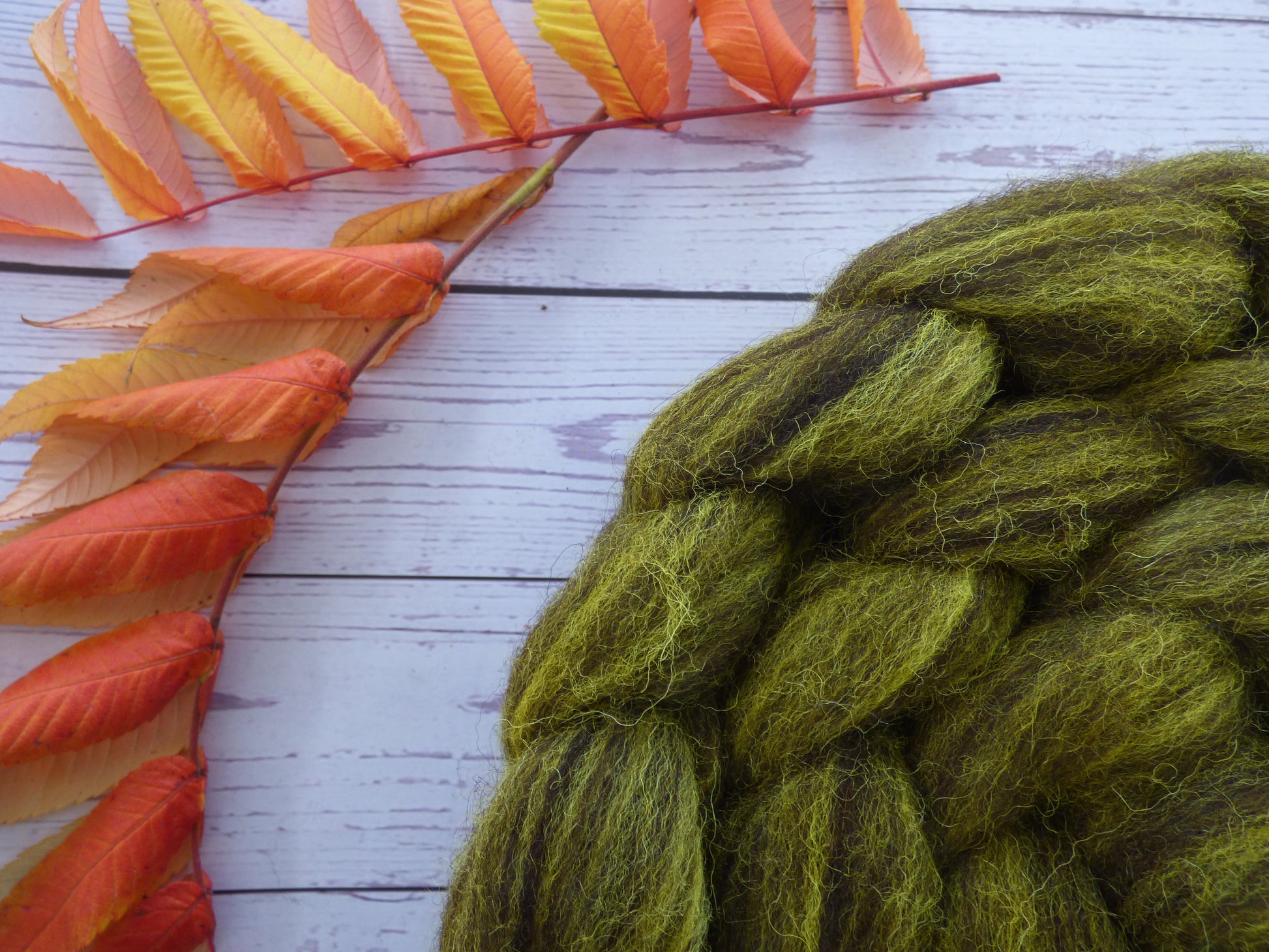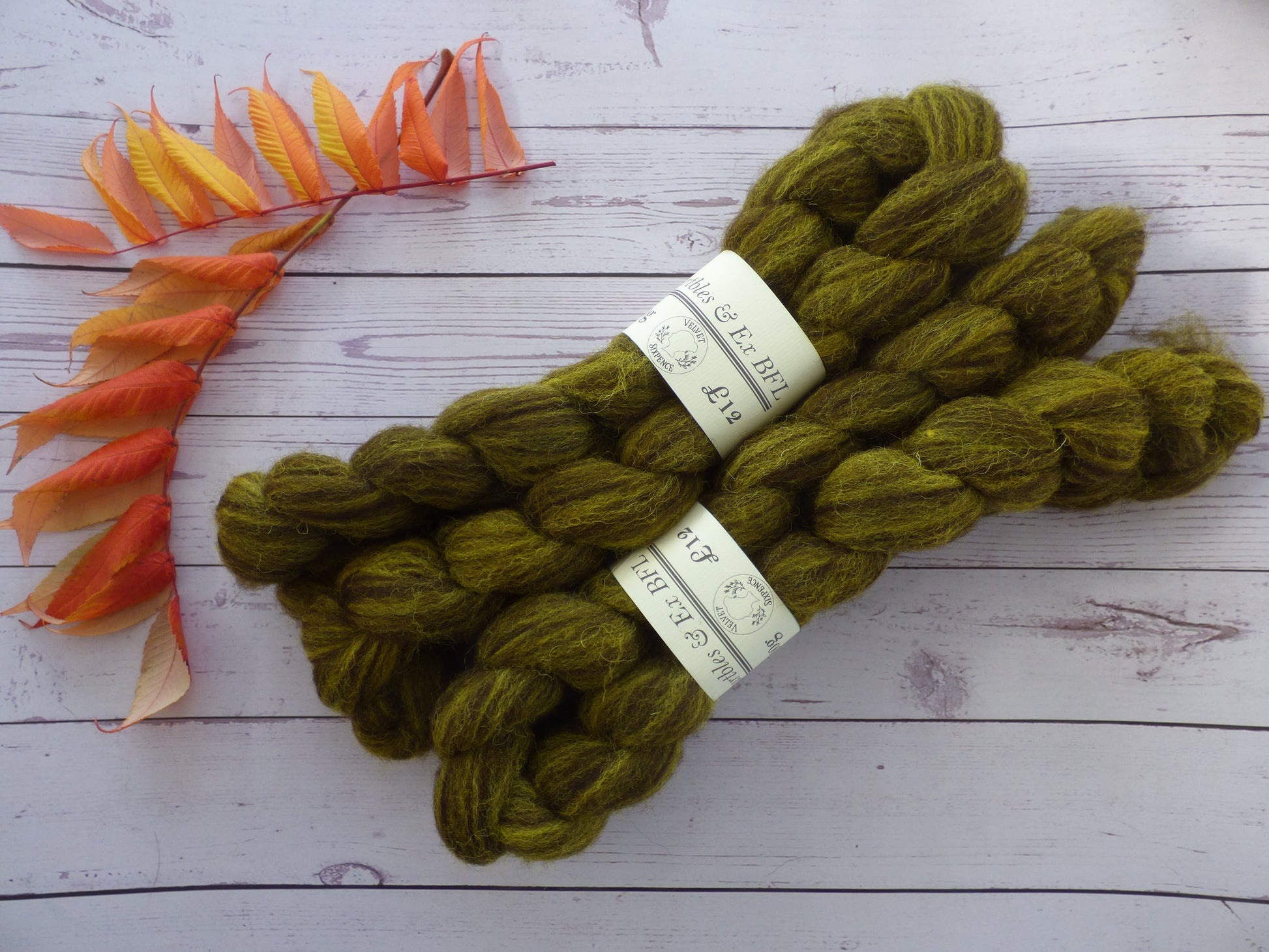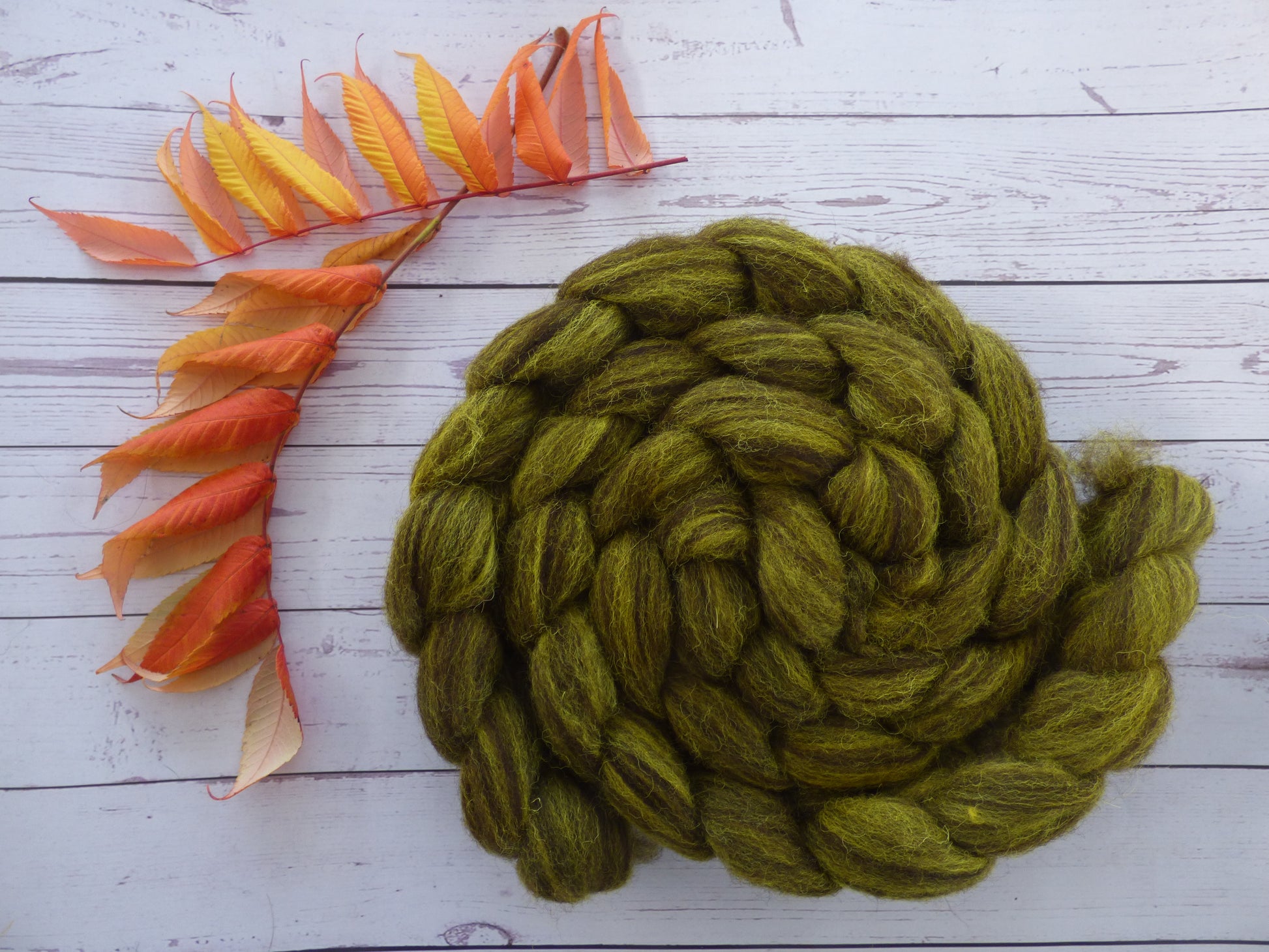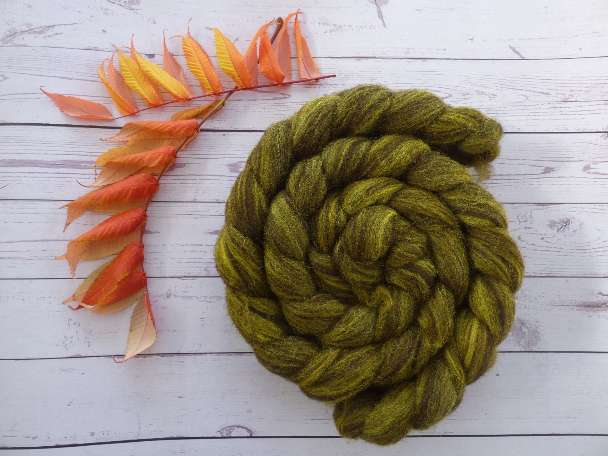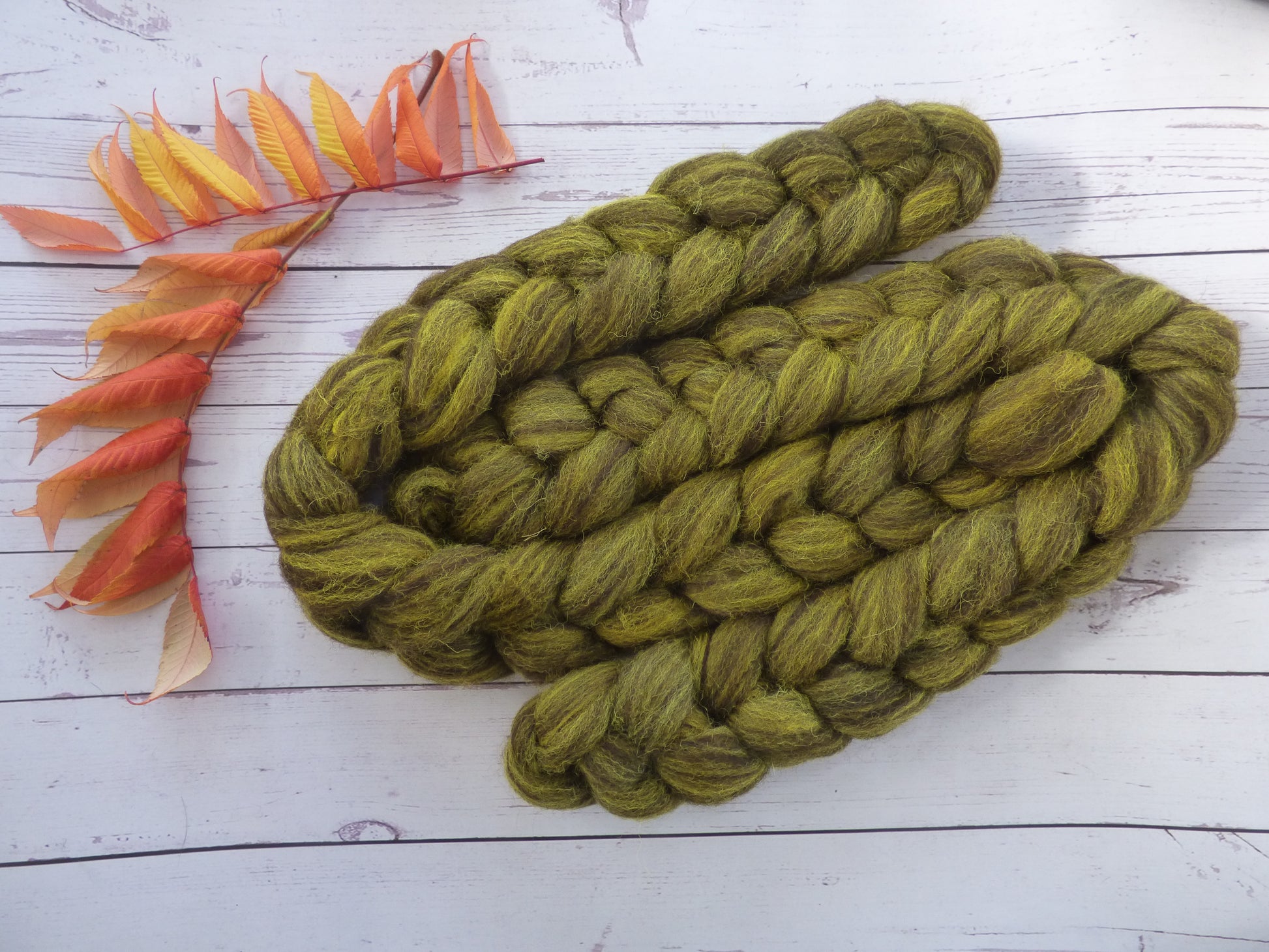 Commercially prepared Zwartbles and Exmoor Blueface top, hand dyed by me using high quality acid dyes in a semi-solid yellow colourway.