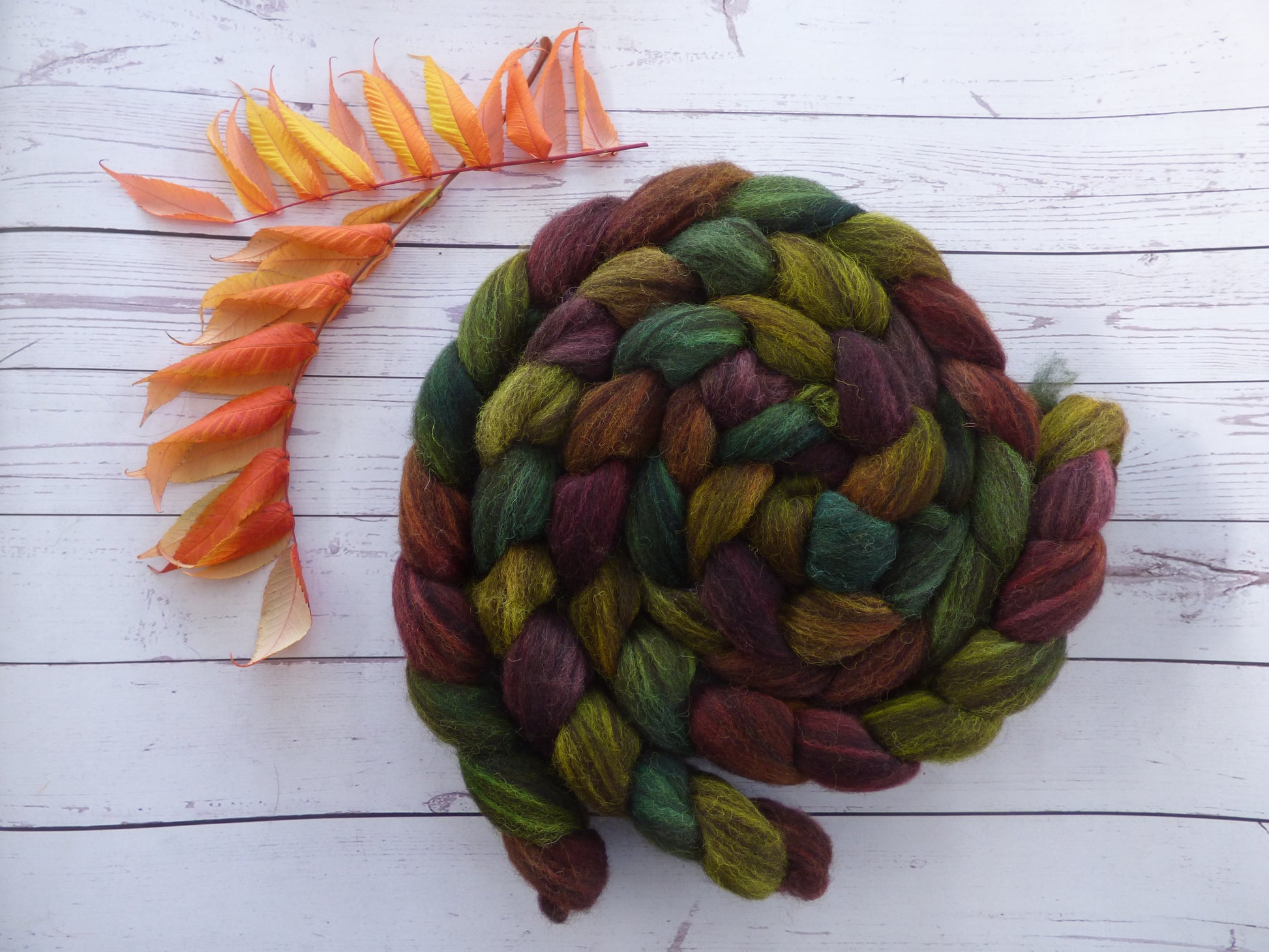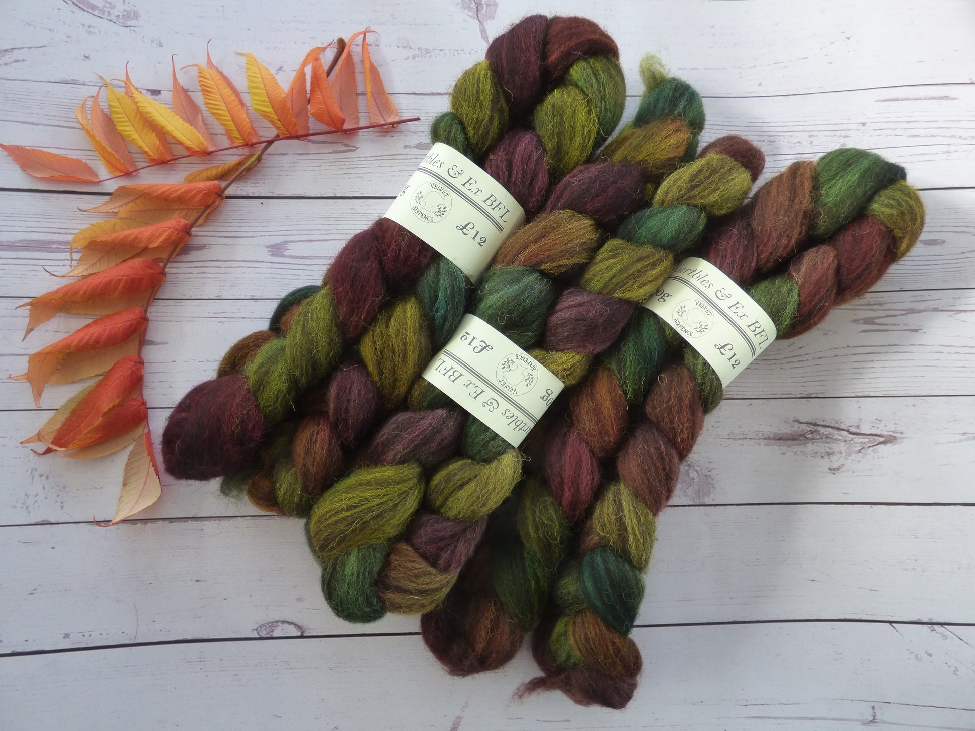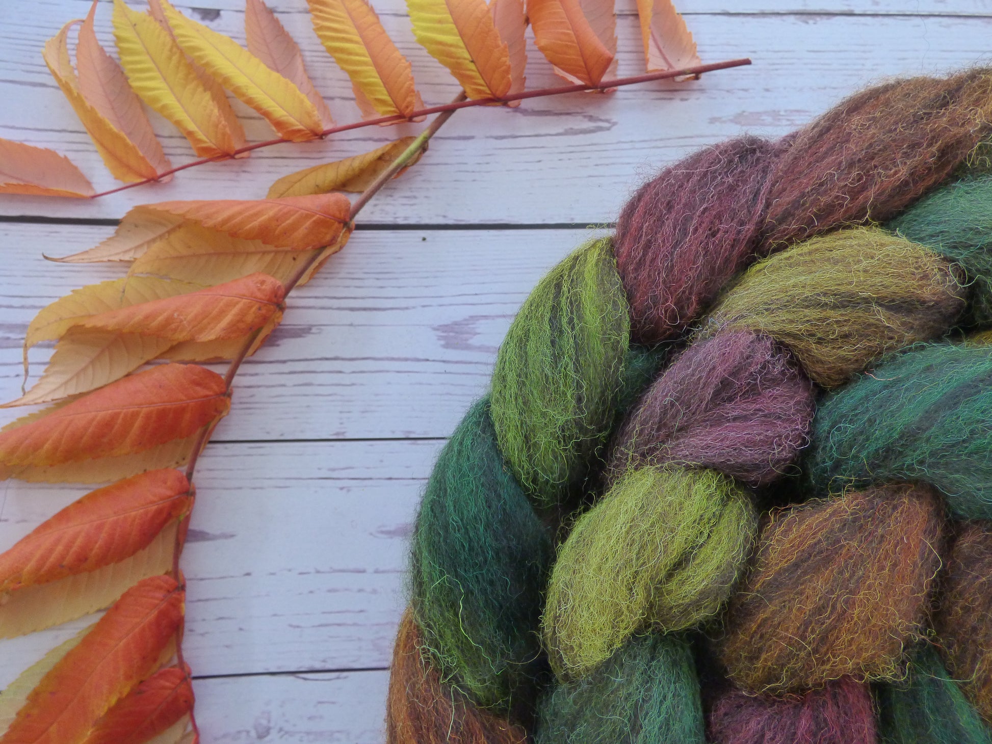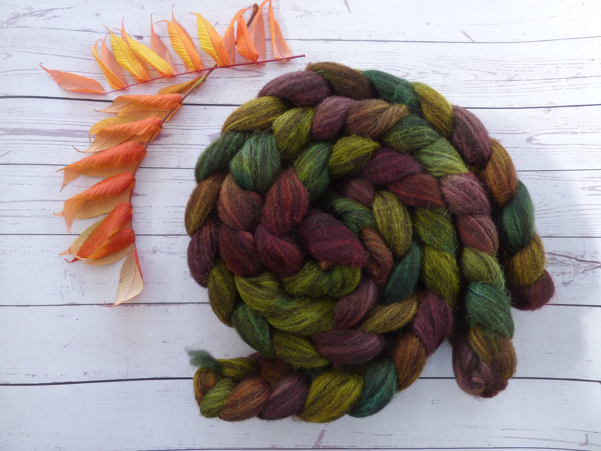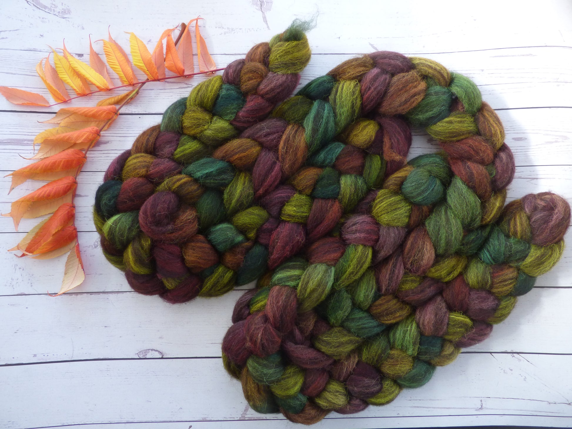 Commercially prepared Zwartbles and Exmoor Blueface top, hand dyed by me using high quality acid dyes in a variegated colourway.